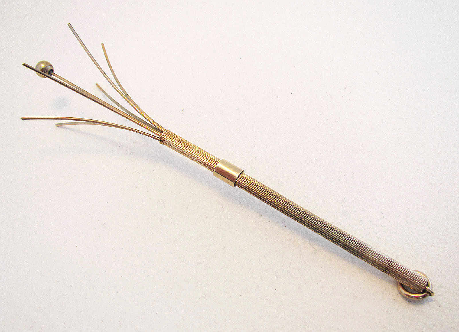 Quality Hallmarked 9ct .375 Karat Solid Yellow Gold English Vintage Retractable Swizzle Cocktail Stick Stirrer. Mid 20Th-Century.