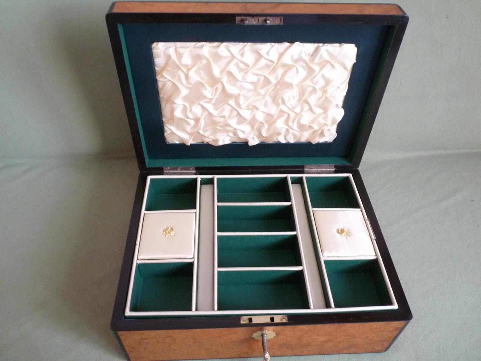 Quality Inlaid Amboyna Jewellery Box+ Tray - Plush Interior c.1860