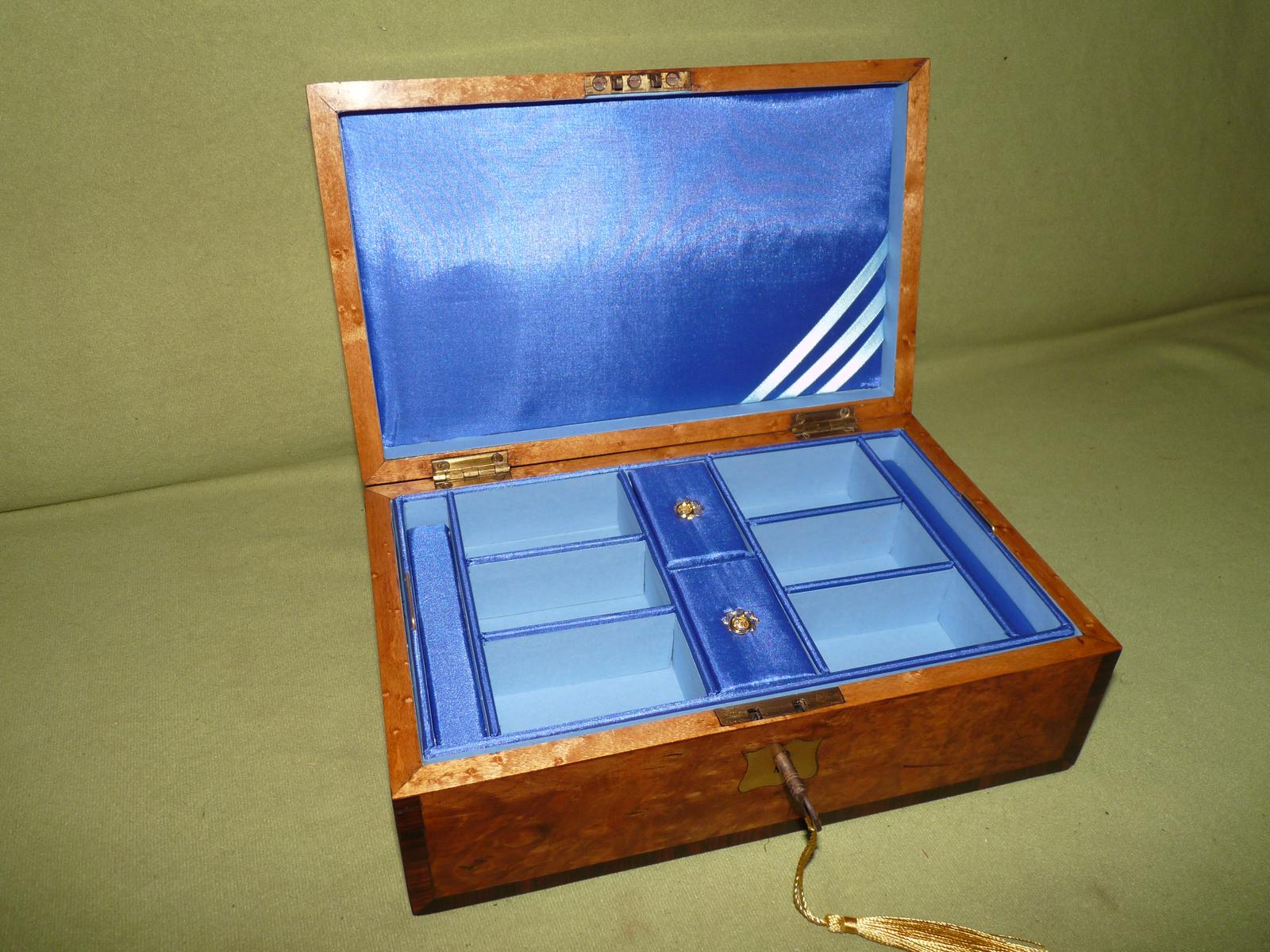 Quality Inlaid Burr Walnut Jewellery Box + Tray - Plush Interior c.1850