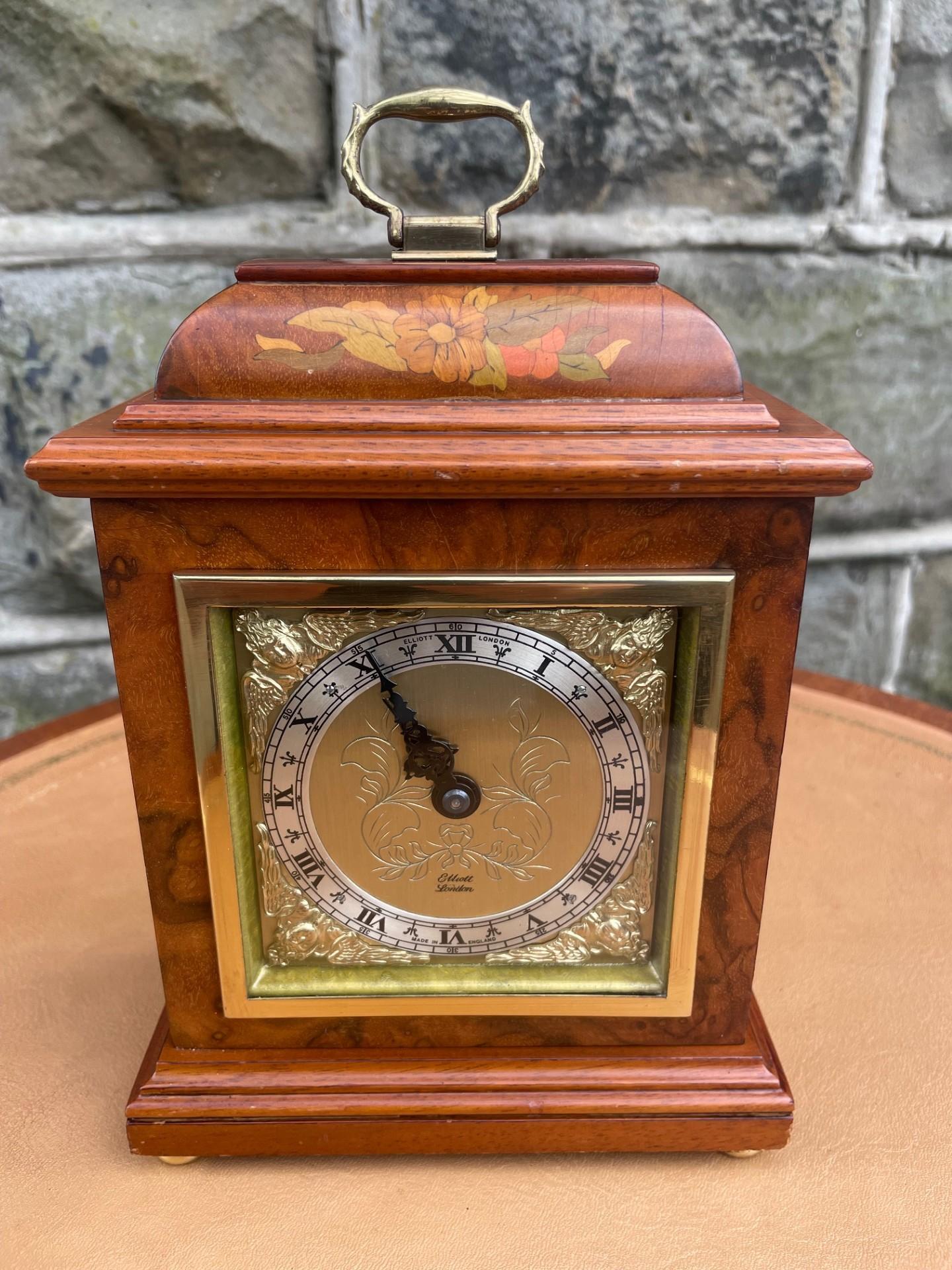This Quality Inlaid Walnut Mantle Clock By Elliott London is located in West Yorkshire, United Kingdom