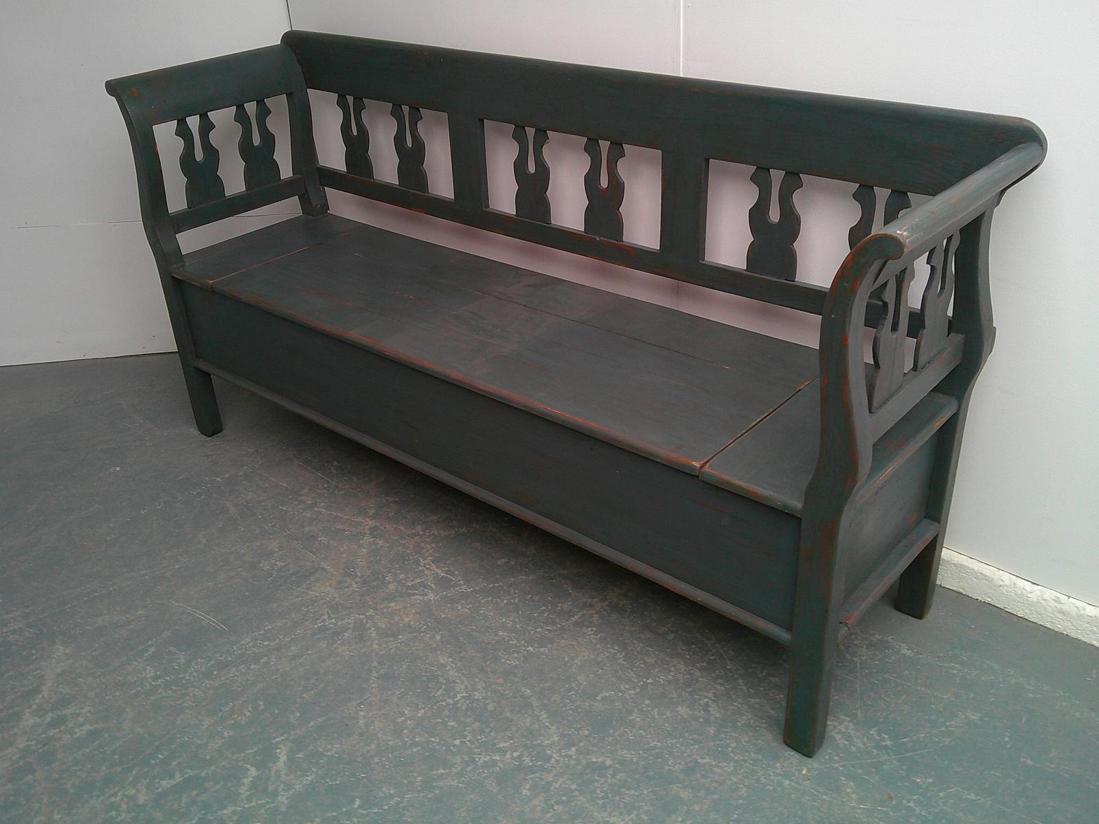 Quality Painted Grey & Green Antique Pine 3 Seater Box Settle / Bench