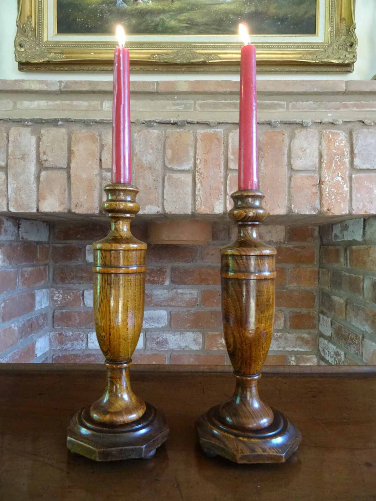 Quality Pair of 1920s English Oak Candlestick Holders - Stunning Patina