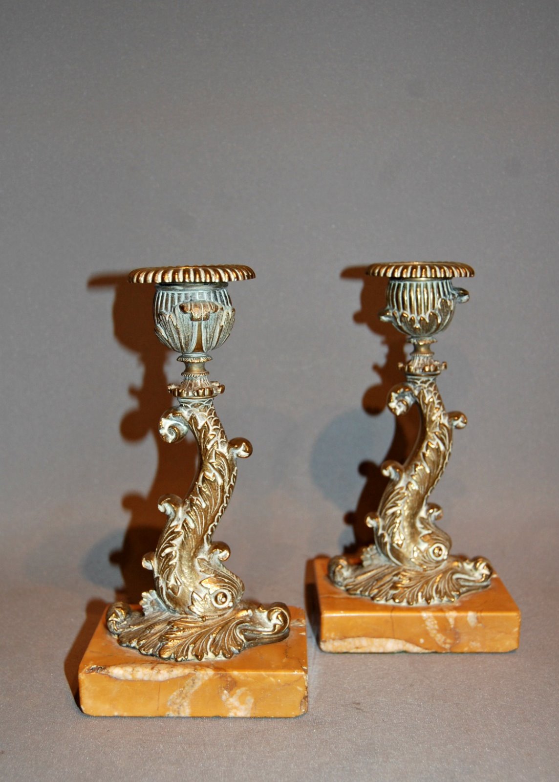 Quality Pair of 19th Century French Brass Candlesticks on Marble Bases in the form of Dolphins
