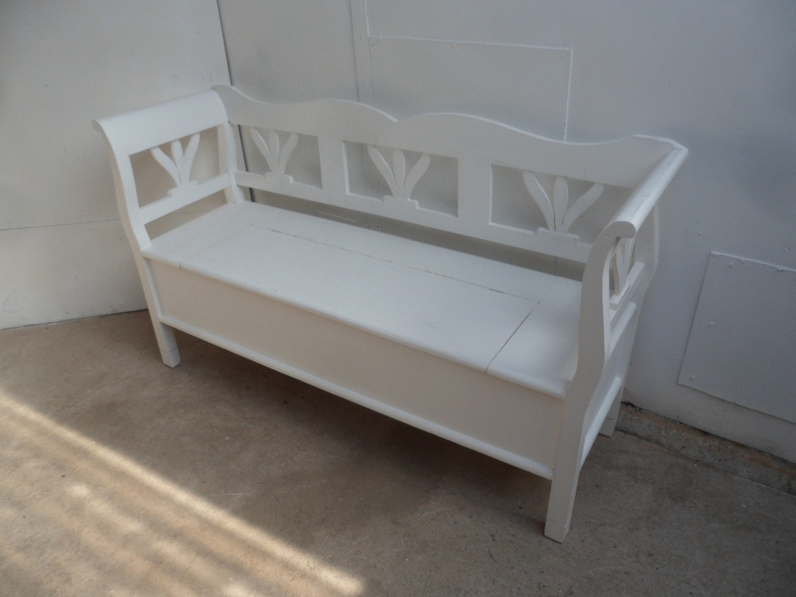 Quality Reclaimed Pine Painted White 2/3 Seater Tulip Scrolled Box Settle / Bench