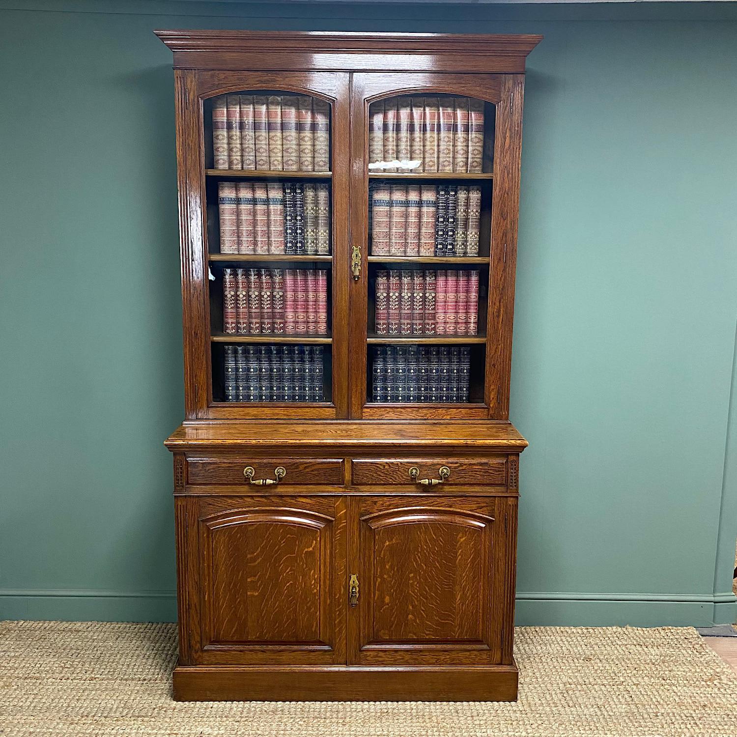 Quality Victorian Oak Antique Glazed Bookcase On Cupboard