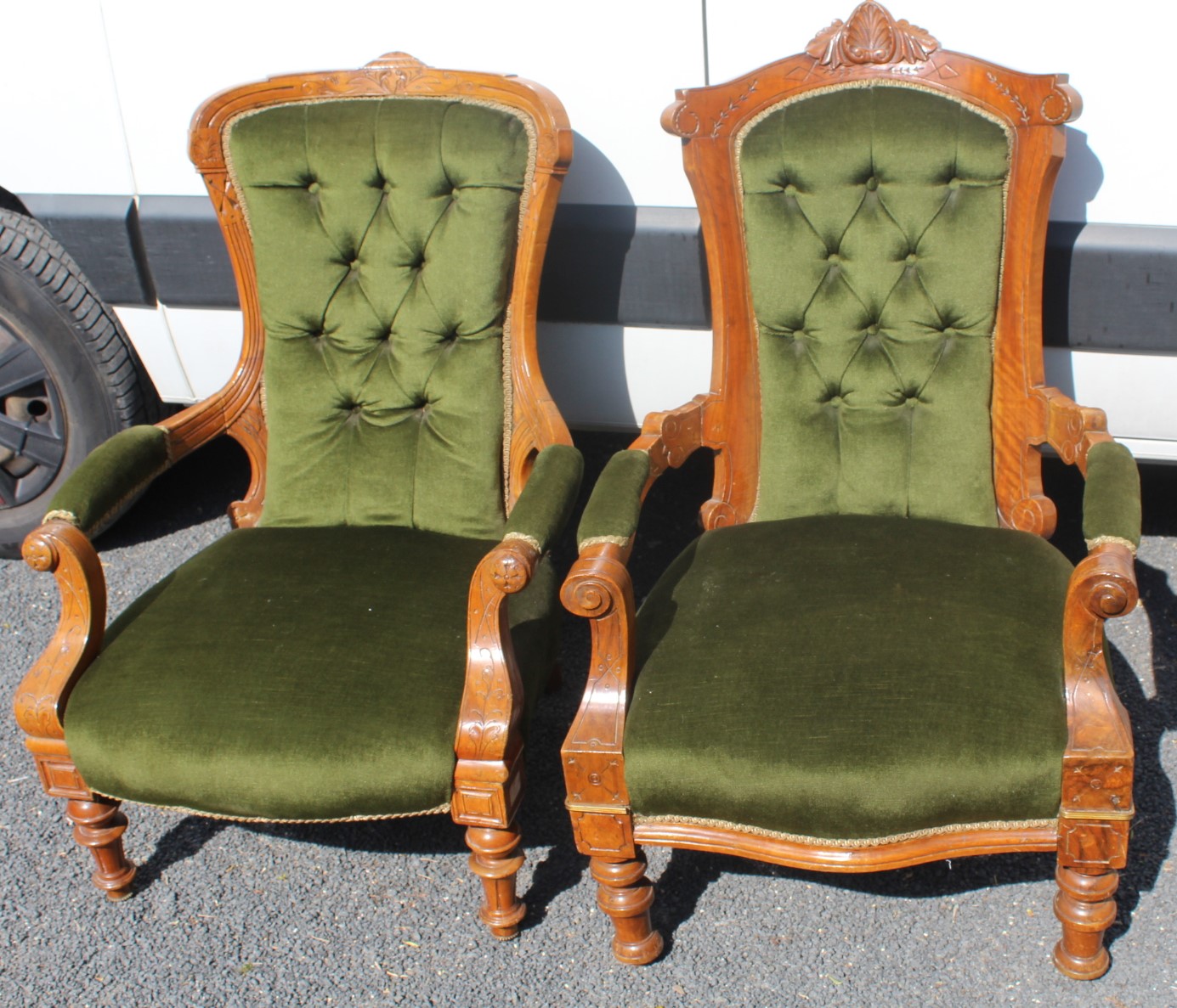 Quality Victorian Walnut Mummy & Daddy Armchair Upholstered in Green