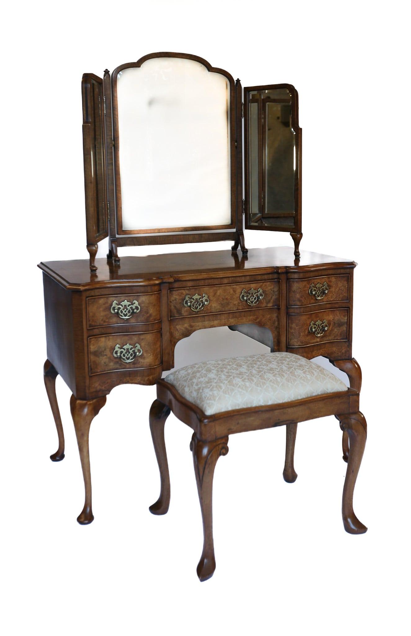 Queen Anne Burr Walnut Dressing Table circa 1930s Burr walnut veneer on top with Walnut Cross Banding Shaped front with 5 drawers, Pierced brass Handles, Sitting on Cabriole shaped legs & pad Feet, With: Walnut Framed Triple dressing Mirror,Bevelled mirror glass with walnut cabriole shape feet With: Walnut framed dressing stool, cabriole legs, with drop in seat recently upholstered & covered with : Cream Ottoman shaped material All recently Polished