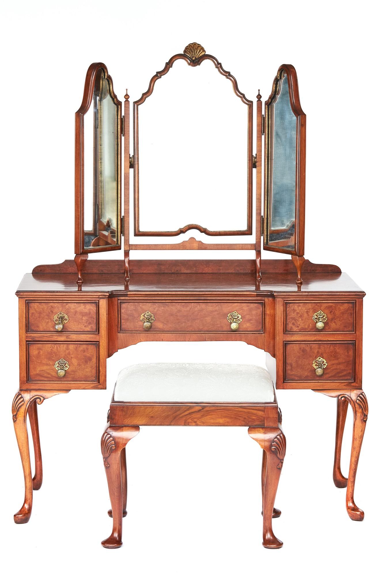 Queen Anne Style Burr Walnut Dressing Table, Mirror & Stool c.1930
