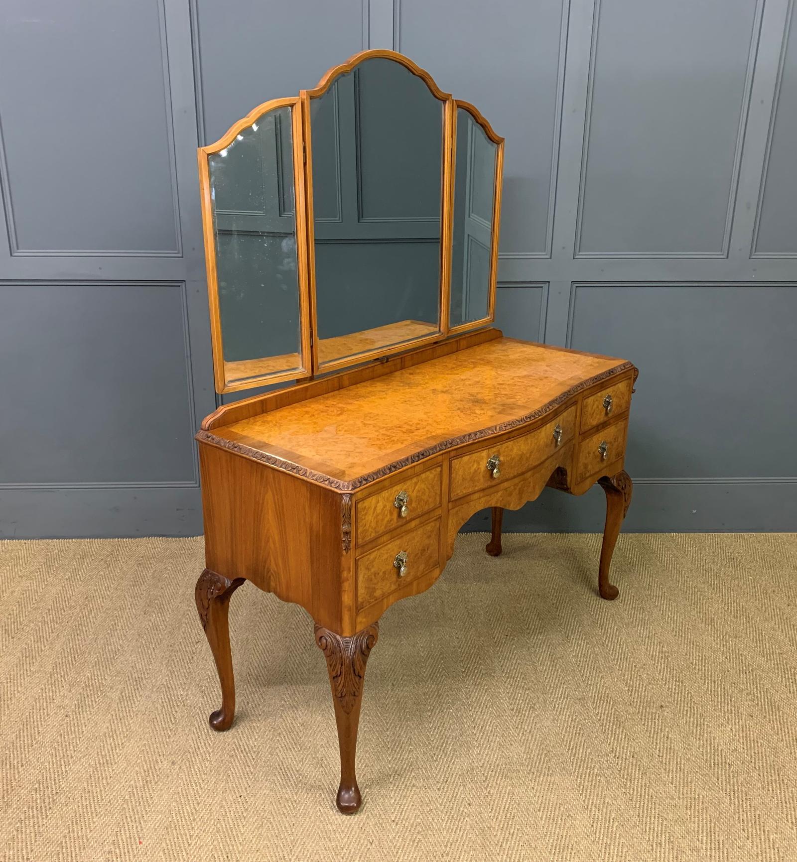 Queen Anne Style Burr Walnut Dressing Table with Triple Mirrors