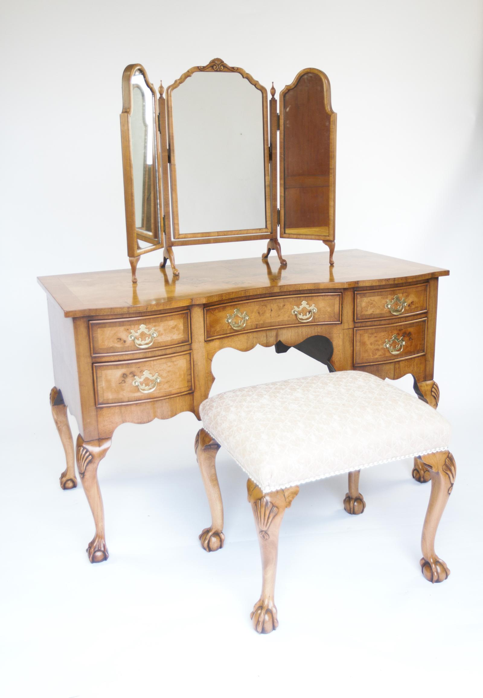 Queen Anne Style Walnut Dressing Table with Mirror & Stool
