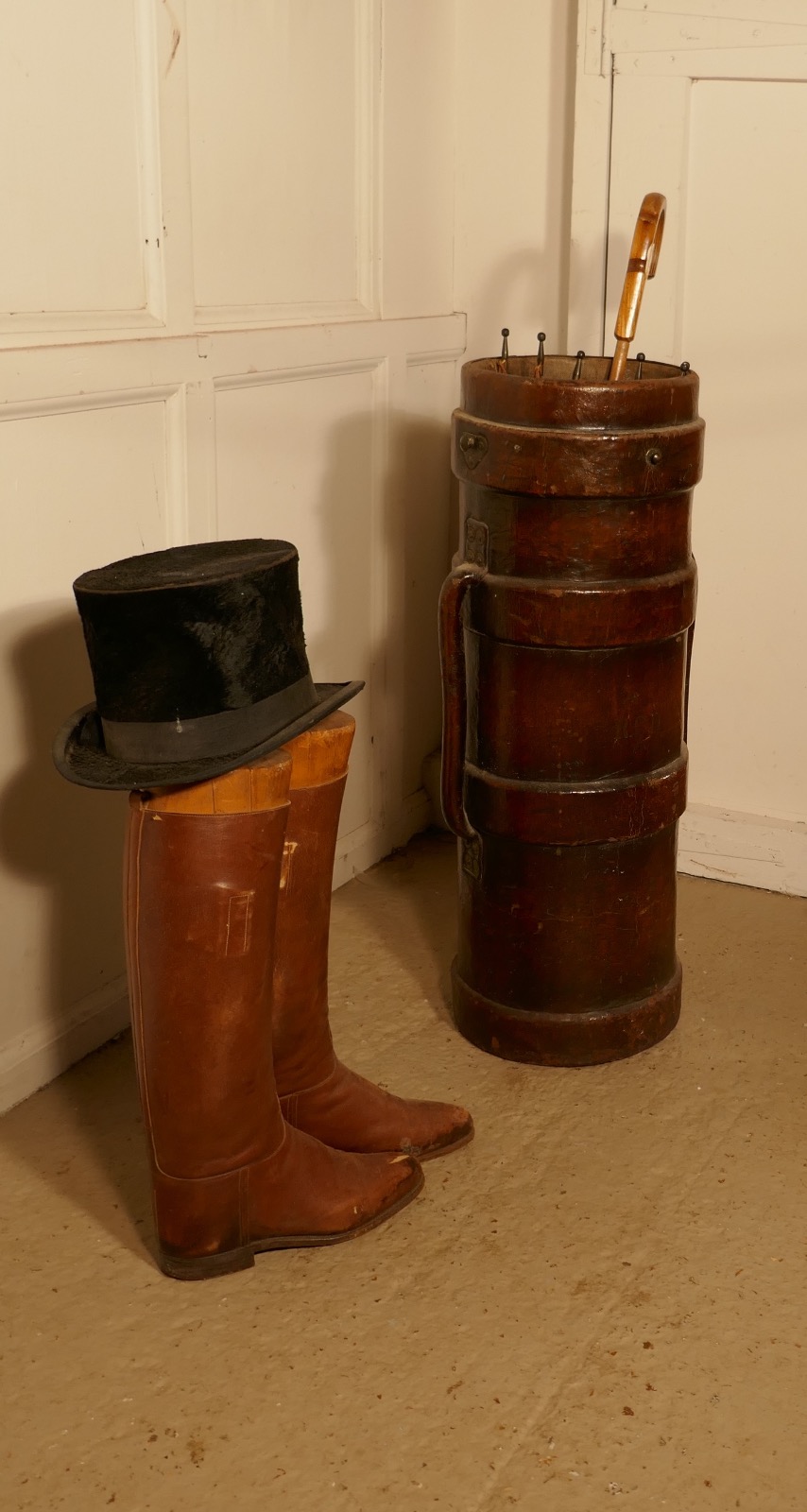 Quirky Leather Umbrella Stand, or WWI Moulded Leather Artillery Shell Carrier with Three Reinforced Bands
