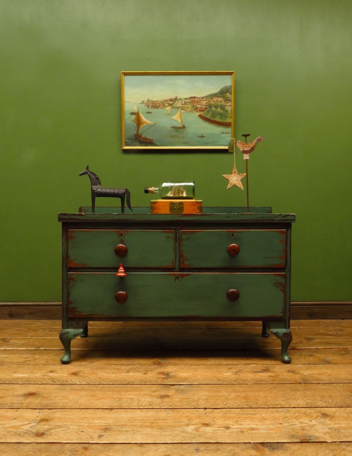 Quirky Low Antique Painted Green Chest of Drawers, Shabby Chic Chest of Drawers