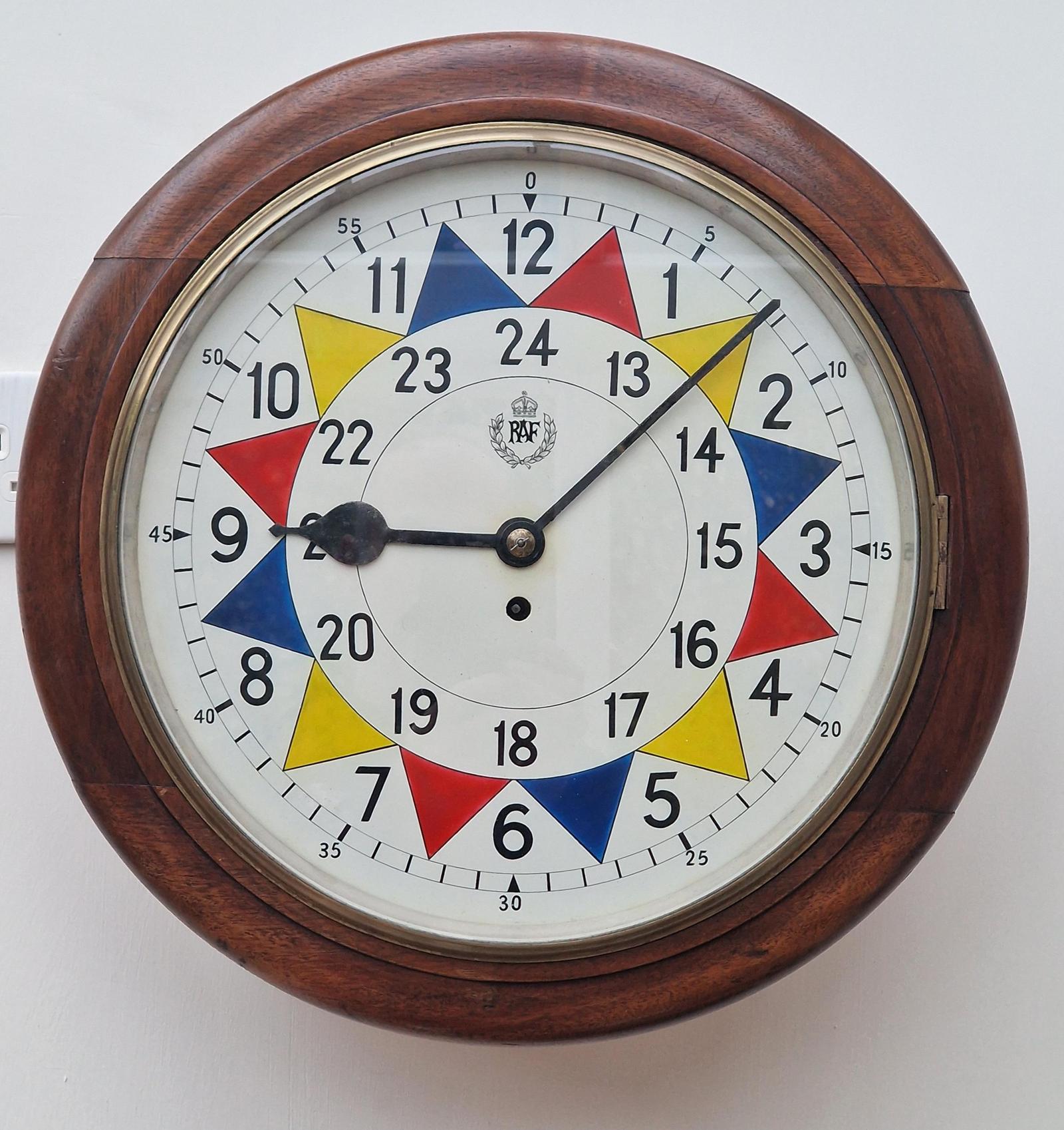 A historically important WW2 period RAF sector clock. A walnut case with a cast brass bezel and bevelled glass. A 14” original dial with the RAF laurel emblem and blued steel hands. The original case bottom lock, key and winding key.