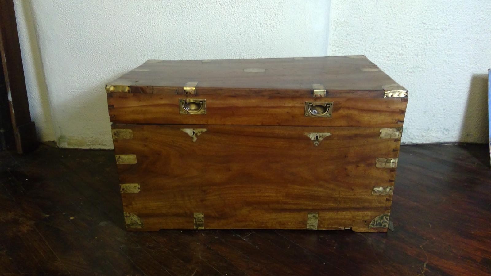 Rare 18th Century Antique Camphor Wood Military Officers Traveling Campaign Trunk of Large Heavy Robust Size, Fitted with Brass Mountings and Full of Character from Its Great Travels and Adventures