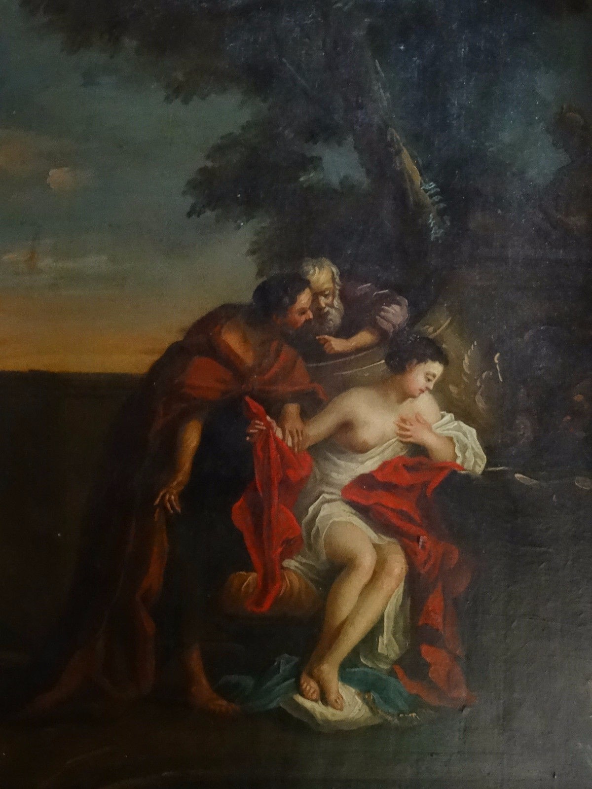 Rare 18th Century Flemish Giltwood Framed Oil on Oak Panel Genre Painting c.1750