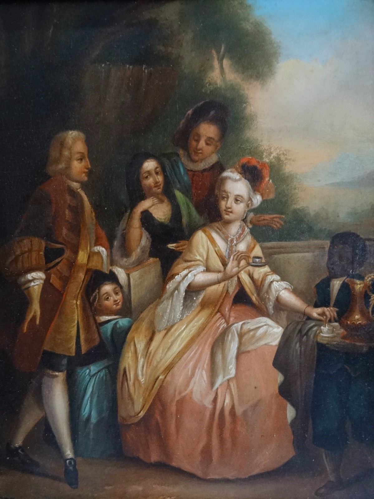 Rare 18th Century Oil on Tin Painting Depicting a Slave Boy with His Masters c.1780