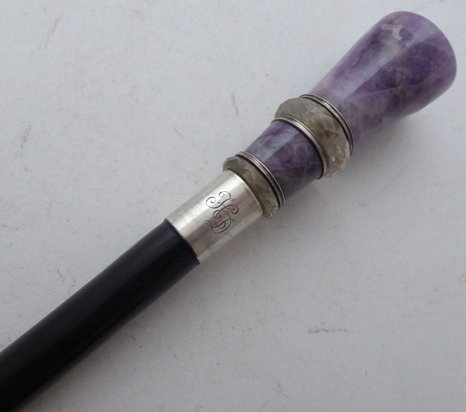 Rare 1912 Amethyst Rock Crystal Walking Stick Cane Silver Collar Ebonised Shaft