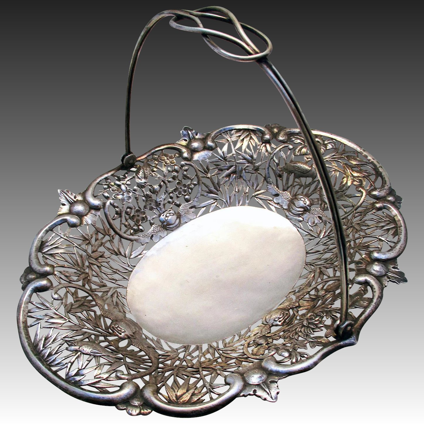 Rare 19th Century Chinese Export Antique Solid Silver Pierced Bowl / Dish / Basket, Swing Handle C.1890
