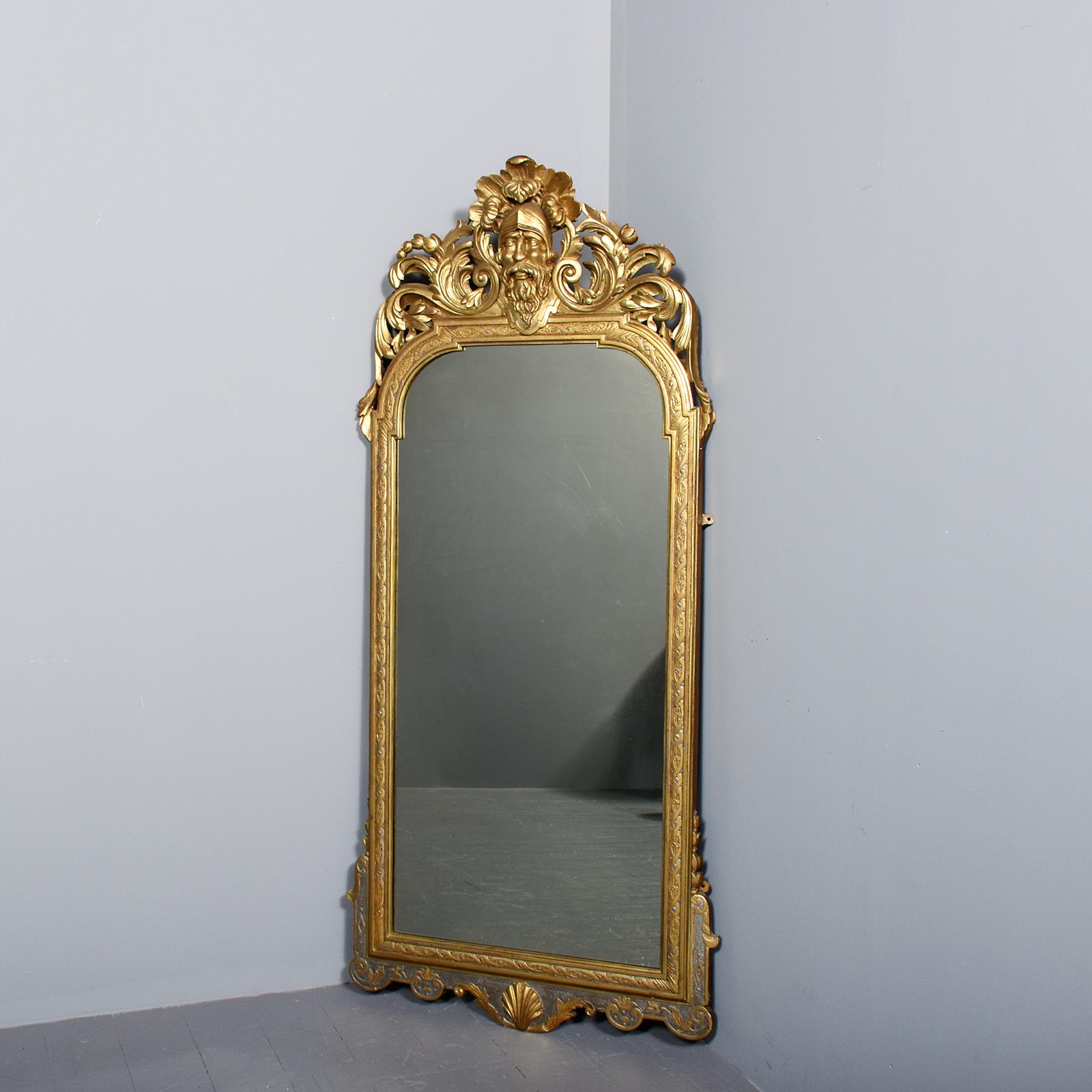 Quality 19th Century (c.1870) Irish Georgian-style carved giltwood tall mirror. The wonderfully carved pediment with open Rococo C scroll and acanthus foliate carvings around a mythical bearded warrior. The carved mirror frame with Celtic knots above a shaped base with a neo-classical carved shell within a foliate background. The mirror retains its original plate.