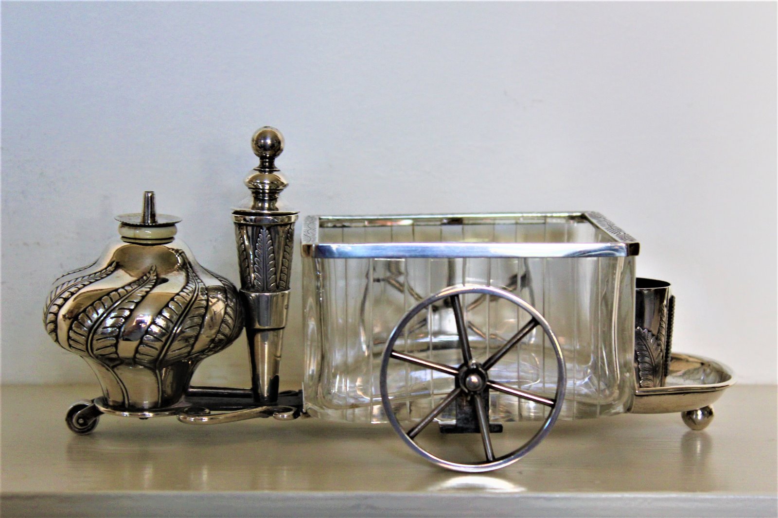 Rare 19th Century Silver & Glass Smokers Accoutrement in the Form of a Fire Cart & Fully Hallmarked London 1889 Maker Edward Stockwell Retailed by Jones 41 St James Street London C.1889