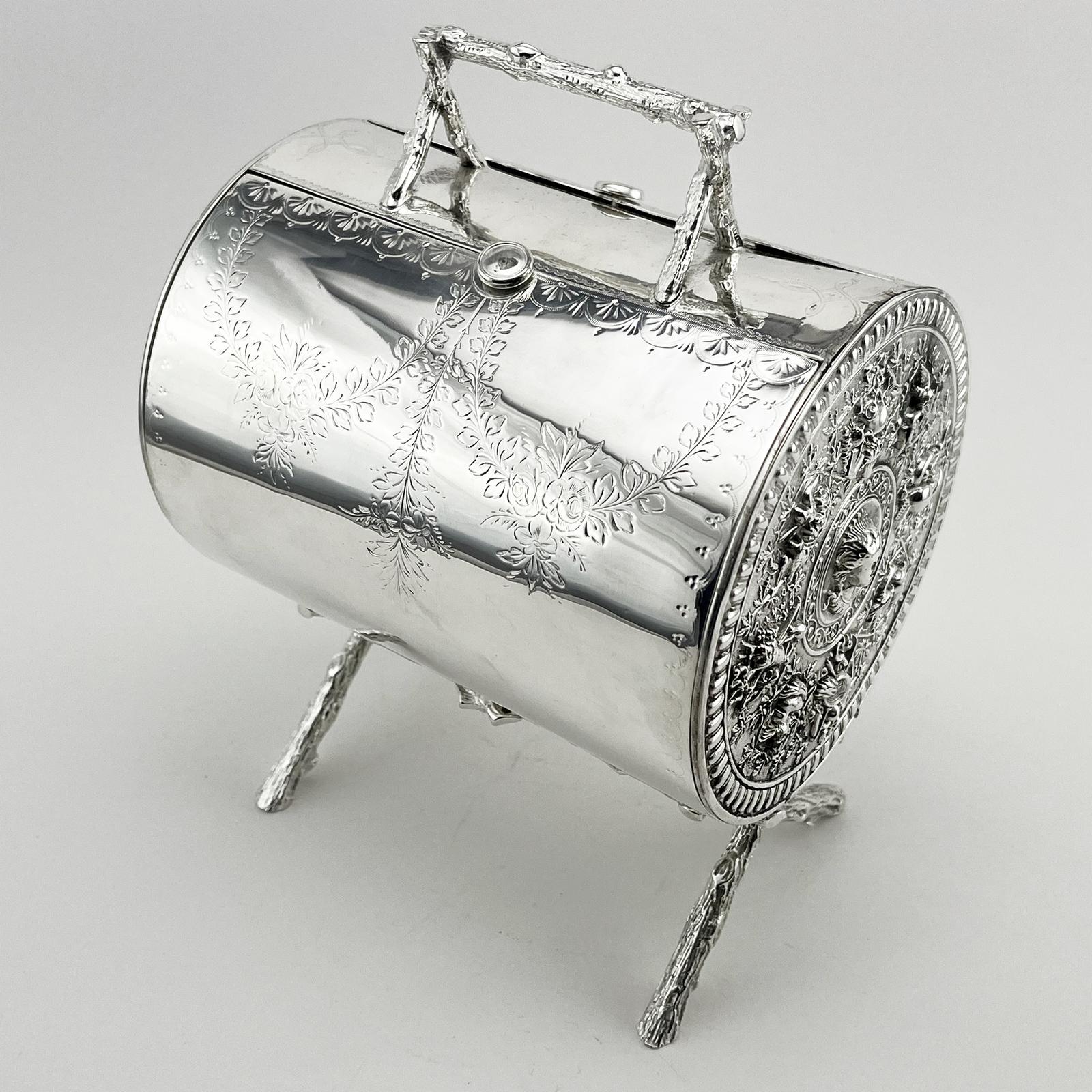 A most rare and unusual Victorian style folding biscuit box. Cylindrical shape with a rustic branch effect handle, push down button to open the box and with pierced floral sides. The body has engraved floral garlands and the sides have been embossed with birds and a female figural motif. Standing on a tripod style rustic branch legs. Very good re silver plated condition.
