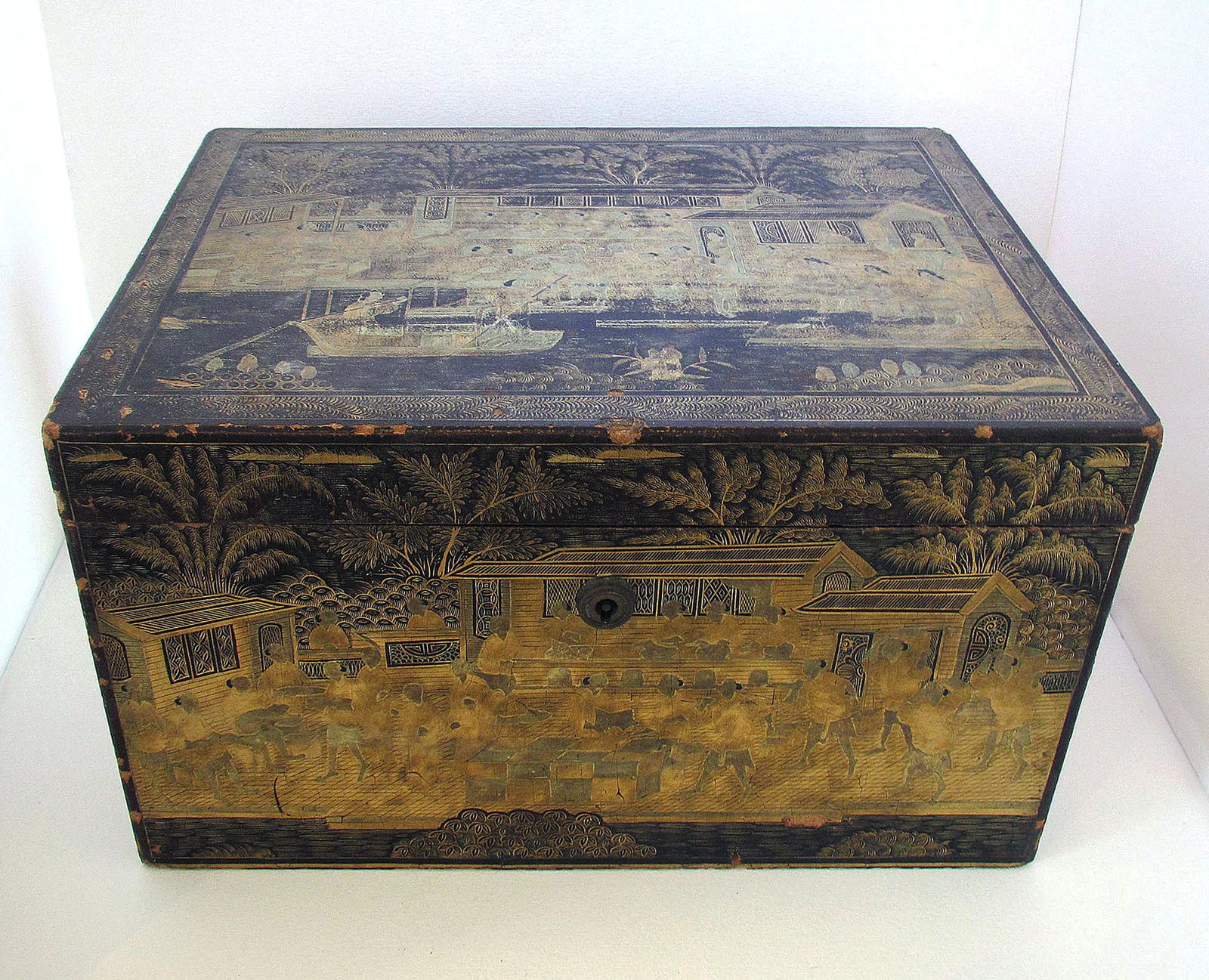 Rare Antique Chinese Lacquered Giltwood Large Tea Caddy Chest / Box / Casket with Pewter Liner c.1800