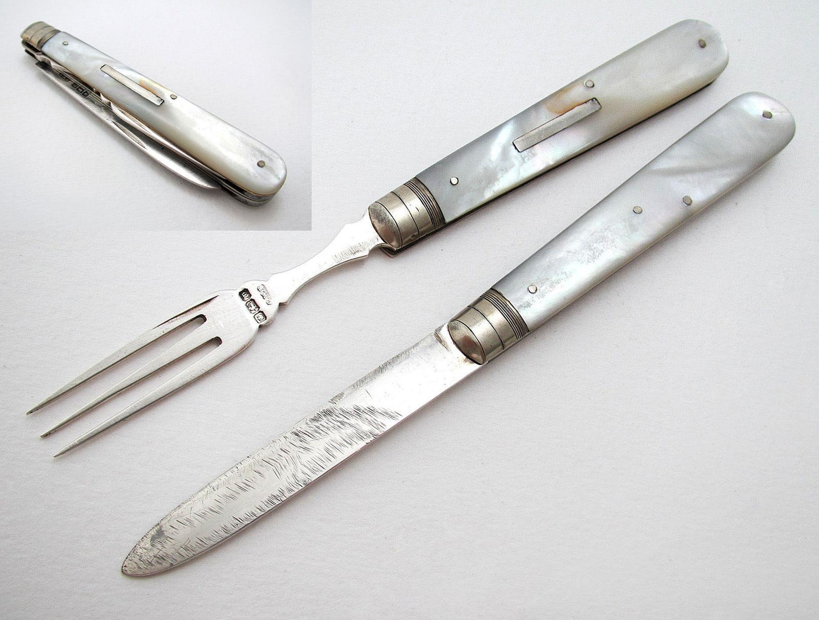 Rare Antique Combined Sterling Silver & Mother of Pearl Folding Fruit Knife and Fork, Sheffield 1914