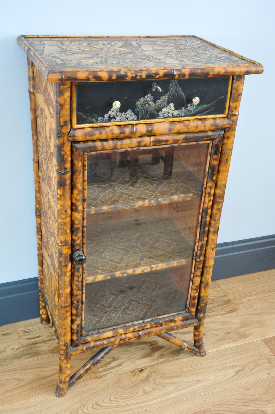 Rare Antique English Bamboo Side Cabinet with Leather Embosed Panels