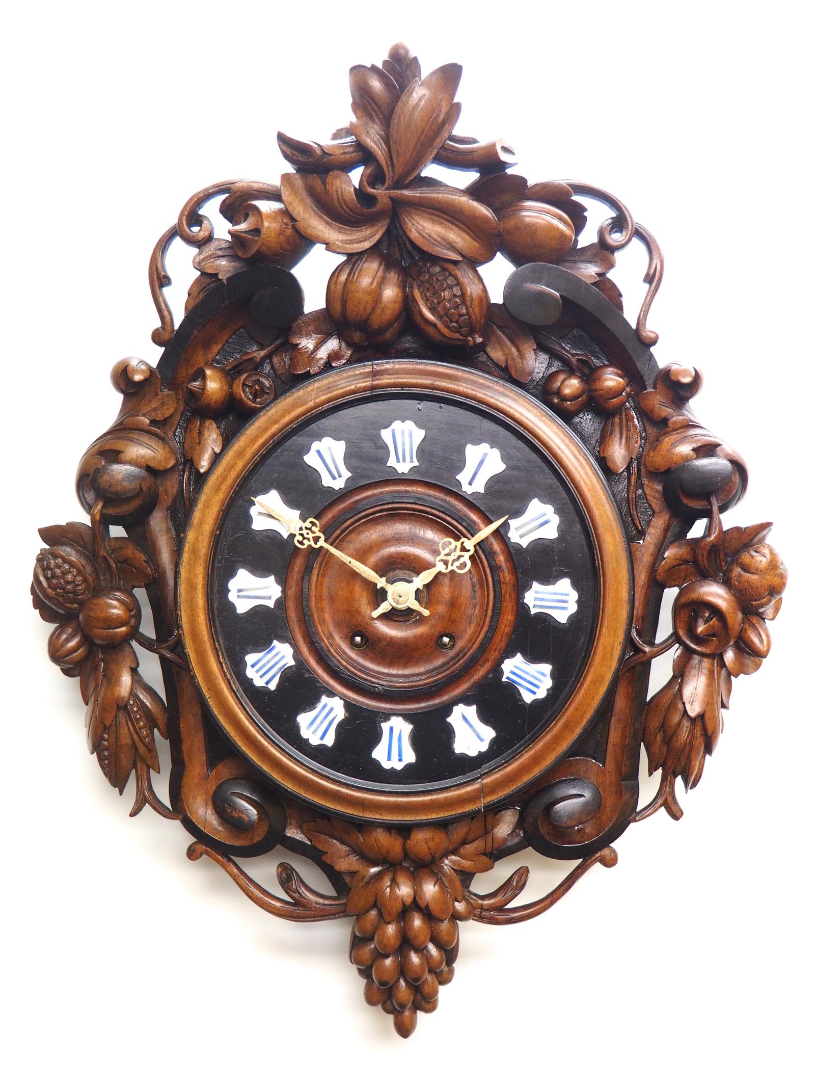 Rare Antique French Carved Dial Wall Clock 8 Day Movement Dial Black Forest Design