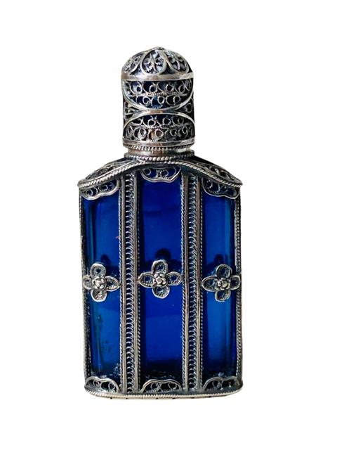 Rare Antique Georgian Silver Filigree Cased Bristol Blue Perfume Scent Bottle 1820