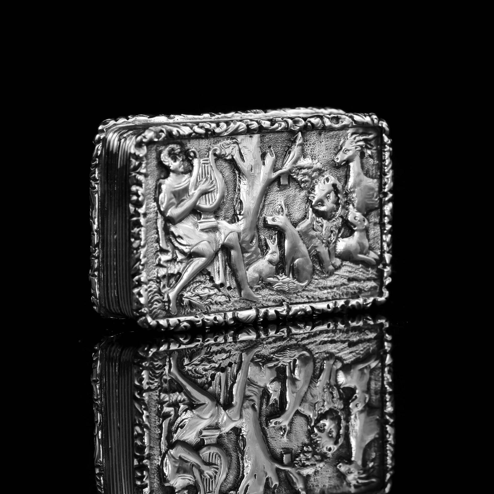 Rare Antique Georgian Solid Silver Vinaigrette Figural Scene with Animals & Harp "Orpheus Enchanting Animals"- Joseph Taylor 1827