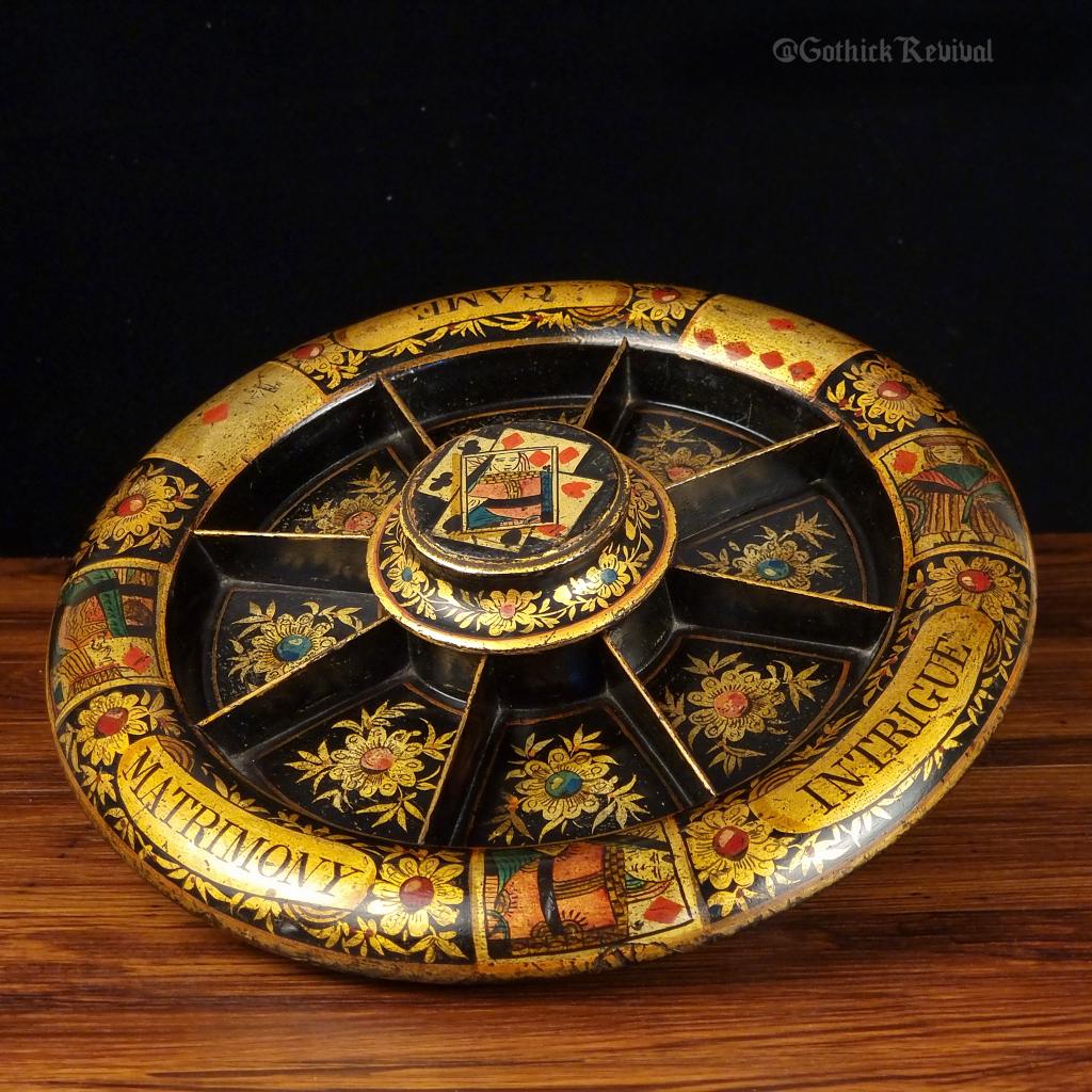 Rare Antique Pope Joan Revolving Game, Victorian Lacquered & Gilded 19th Century