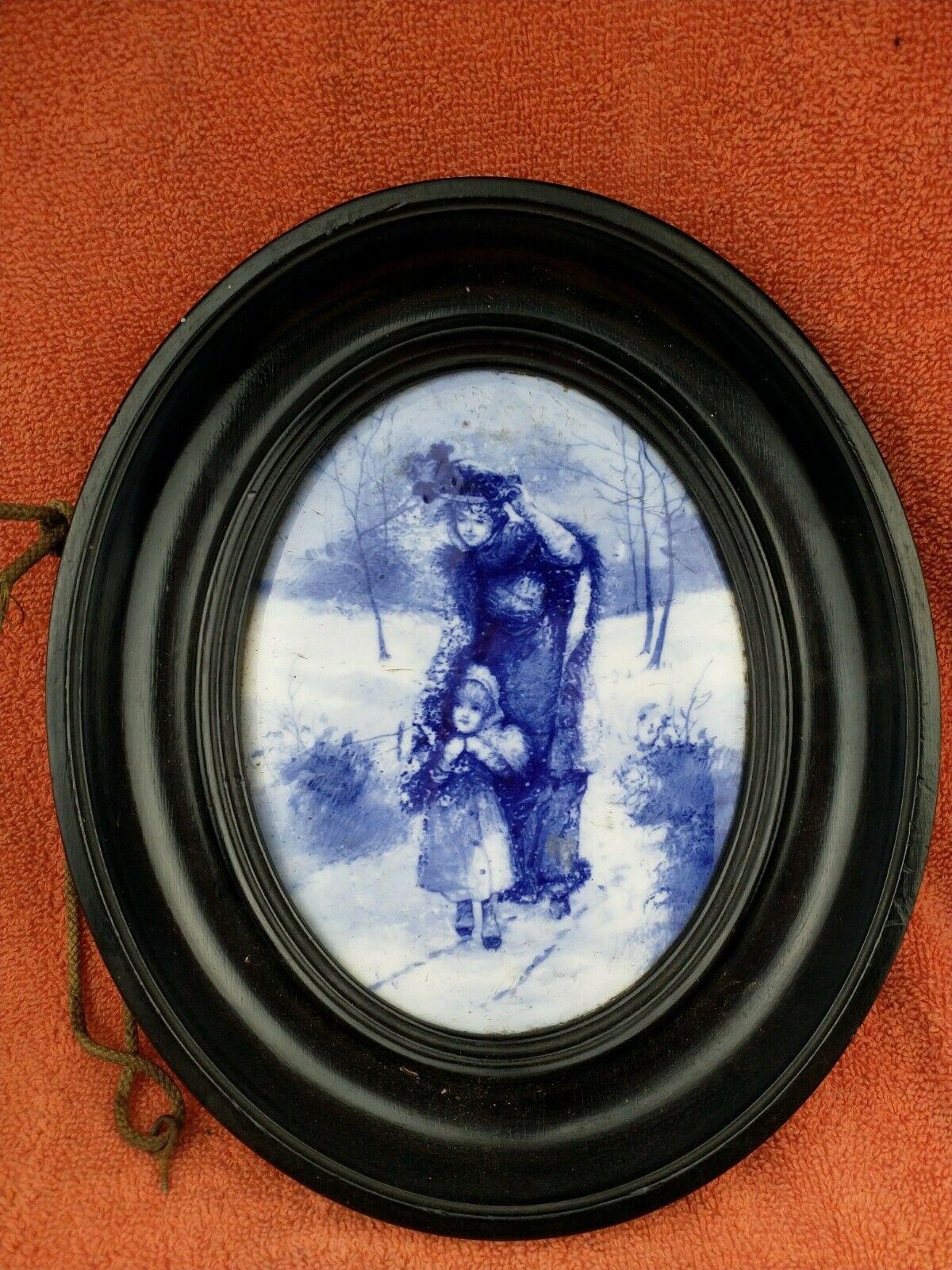 Rare Antique Royal Doulton Blue & White Mother & Girl Framed Oval Plaque C1910