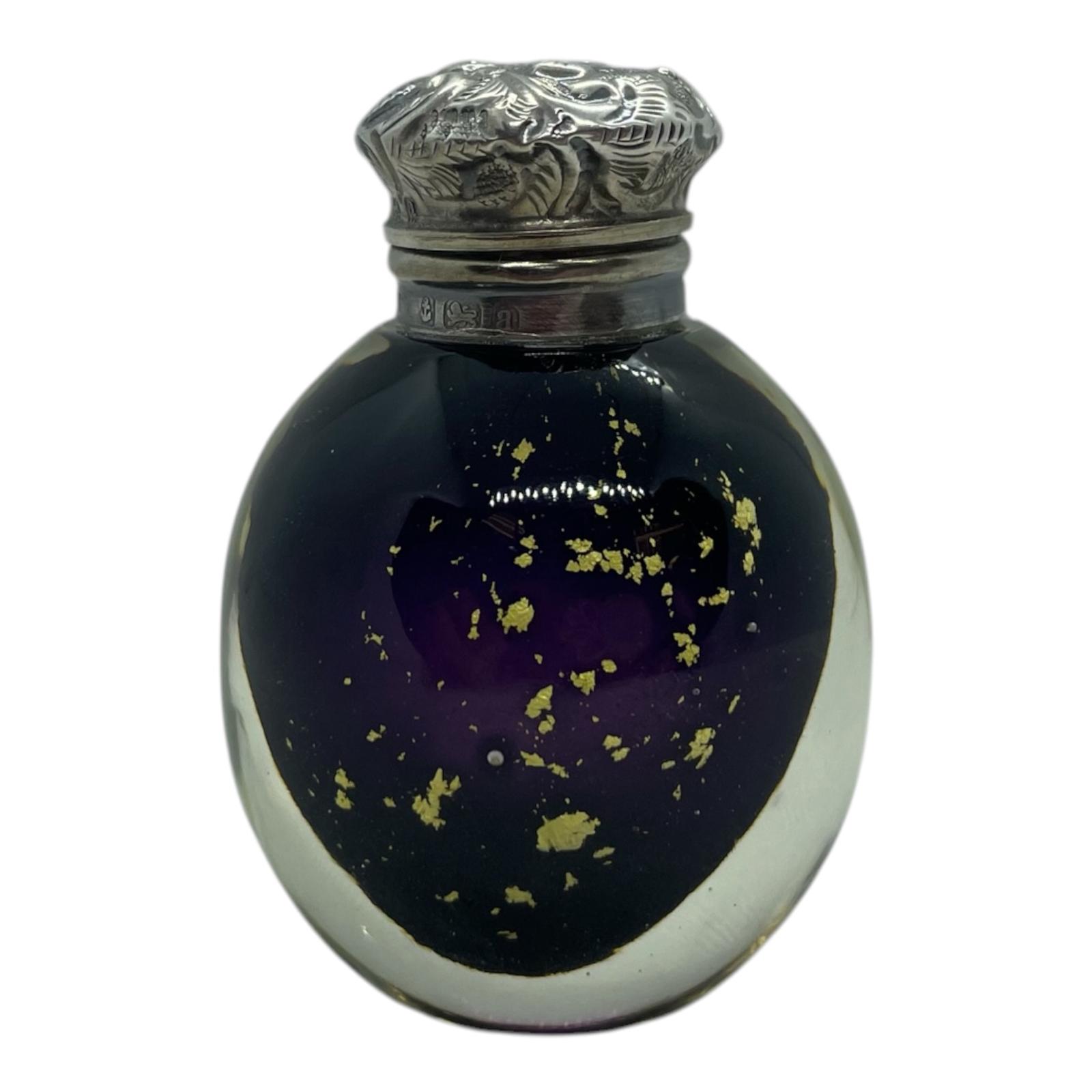 A very rare, Antique Victorian Silver perfume bottle with a gold fleck and amethyst glass body