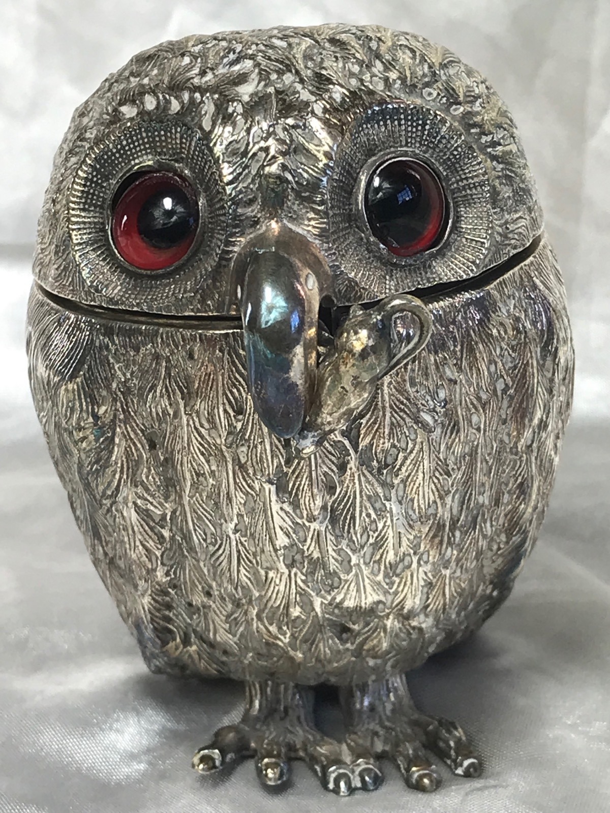 Rare Antique Victorian Silver Plate Owl Mustard Pot Mouse Spoon after George Fox (1 of 1)