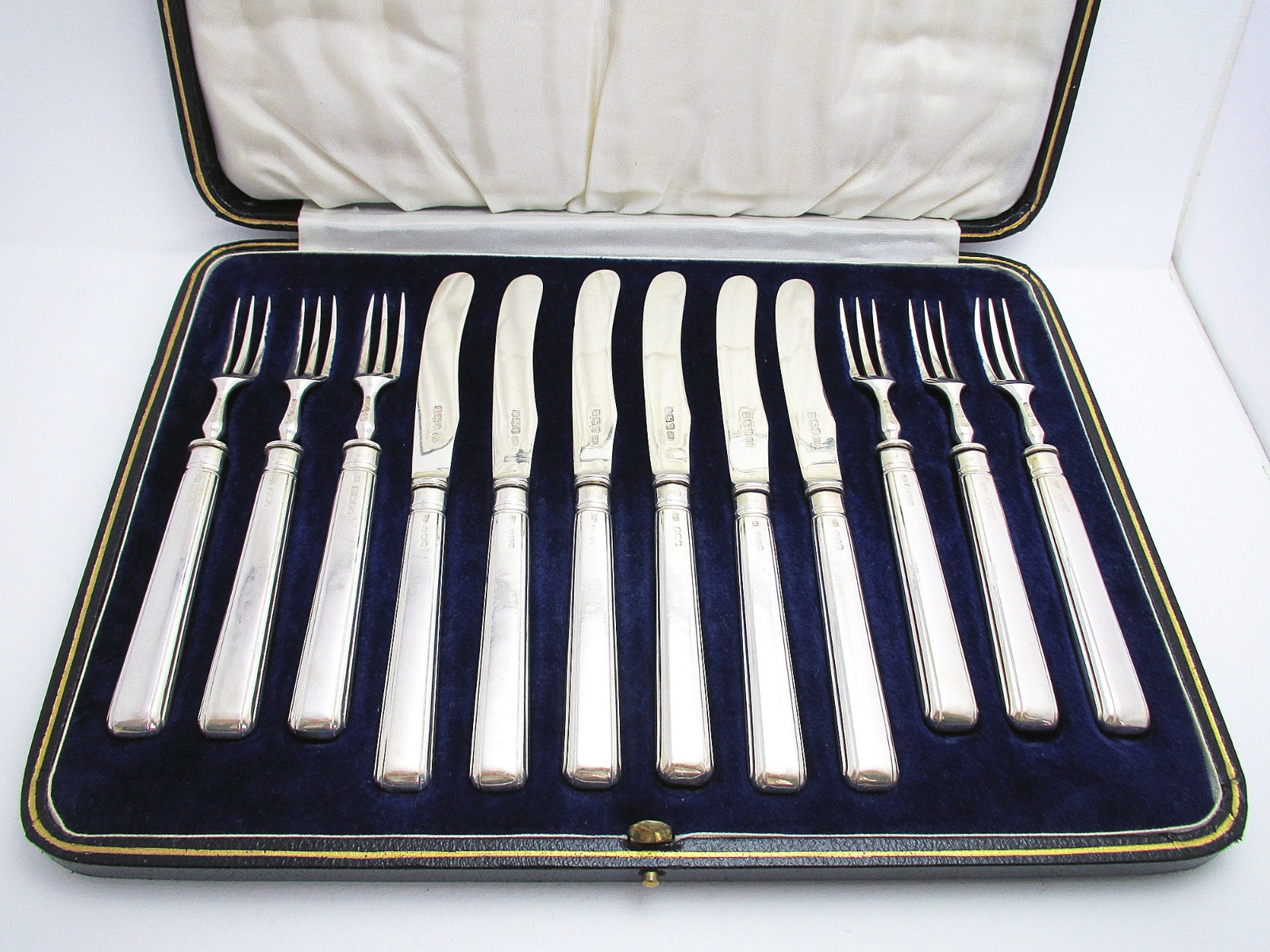 Rare Art Deco Quality Set, Solid Sterling Silver Fruit / Starter / Cake / Dessert Serving Knives & Forks Antique Cutlery with Original Box (1 of 11)