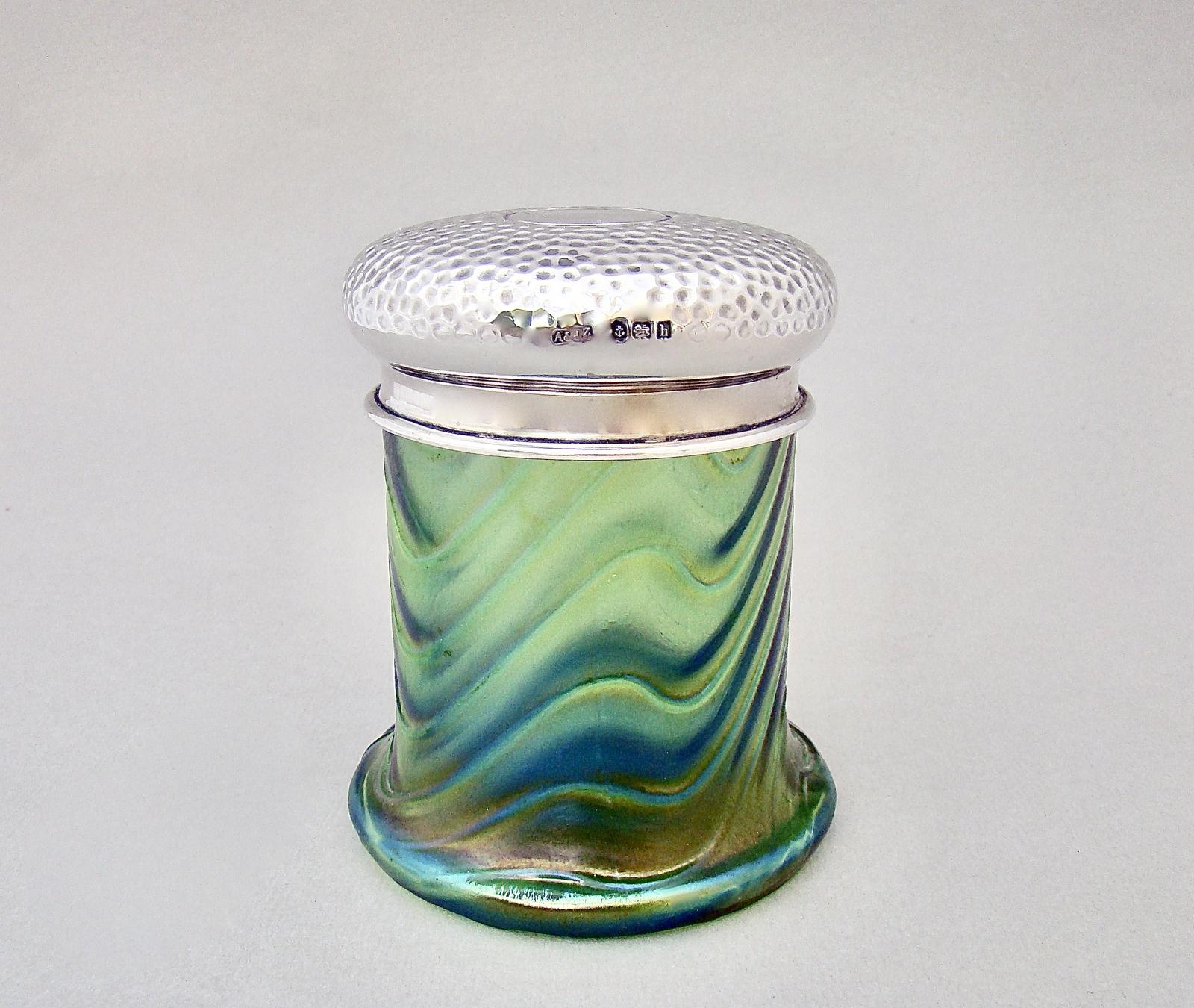 Rare Art Nouveau Silver Mounted Iridescent Loetz Glass Vanity Jar By A&J Zimmerman, Birmingham 1907