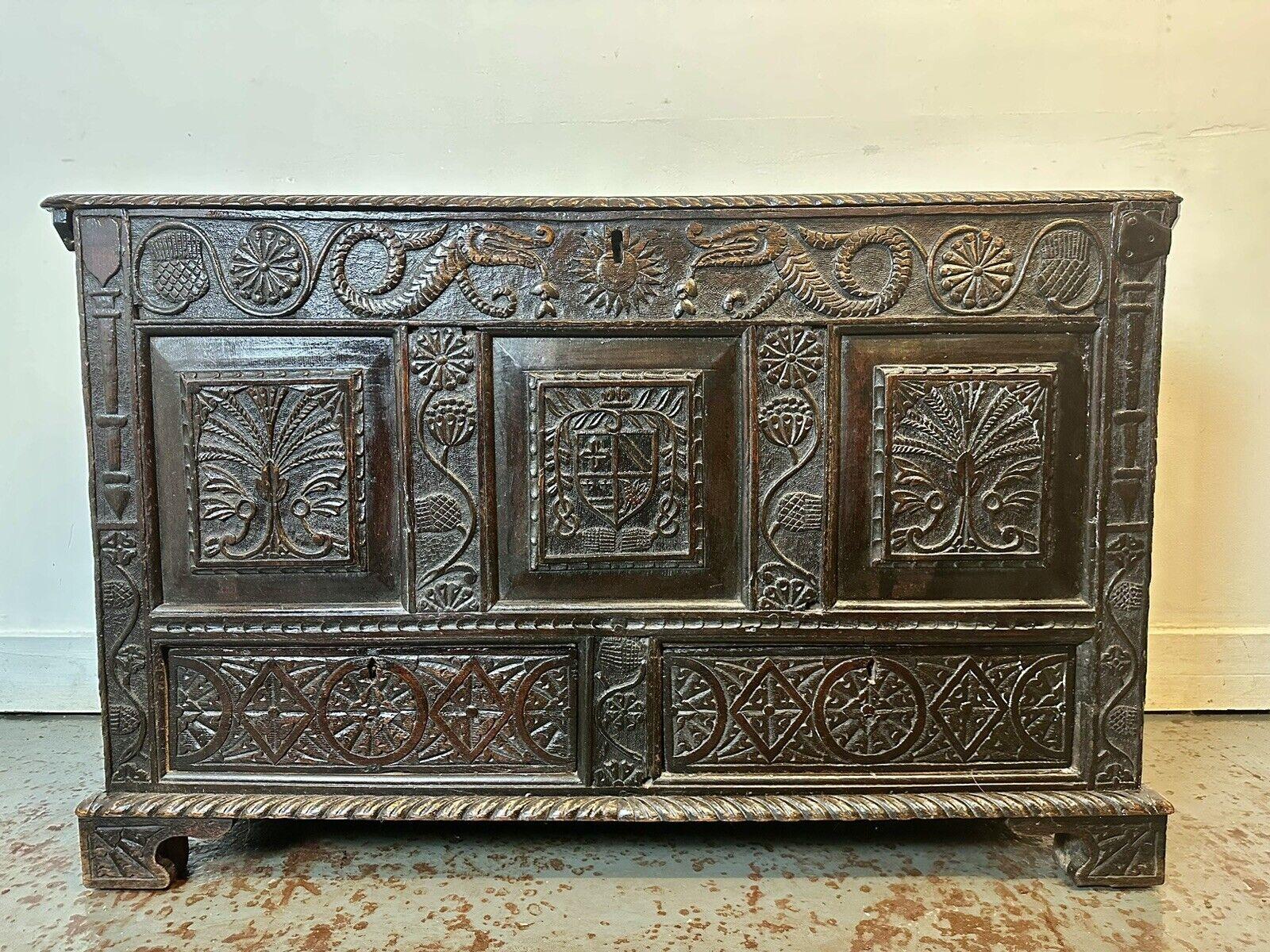 Rare & Beautiful 300 Year Old Antique Oak George I Carved Mule Chest c.1720