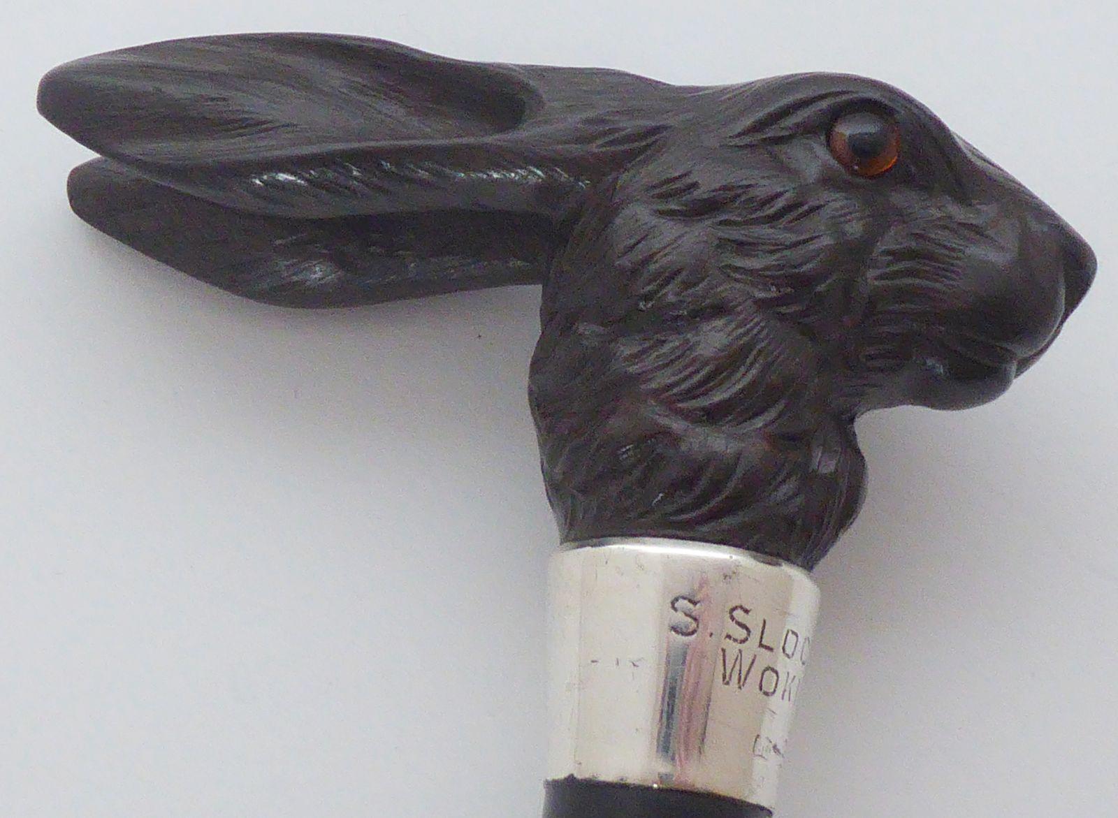 Rare Carved Hare Head Walking Stick Cane 1902 Hallmarked Solid Silver Top Ebony Shaft