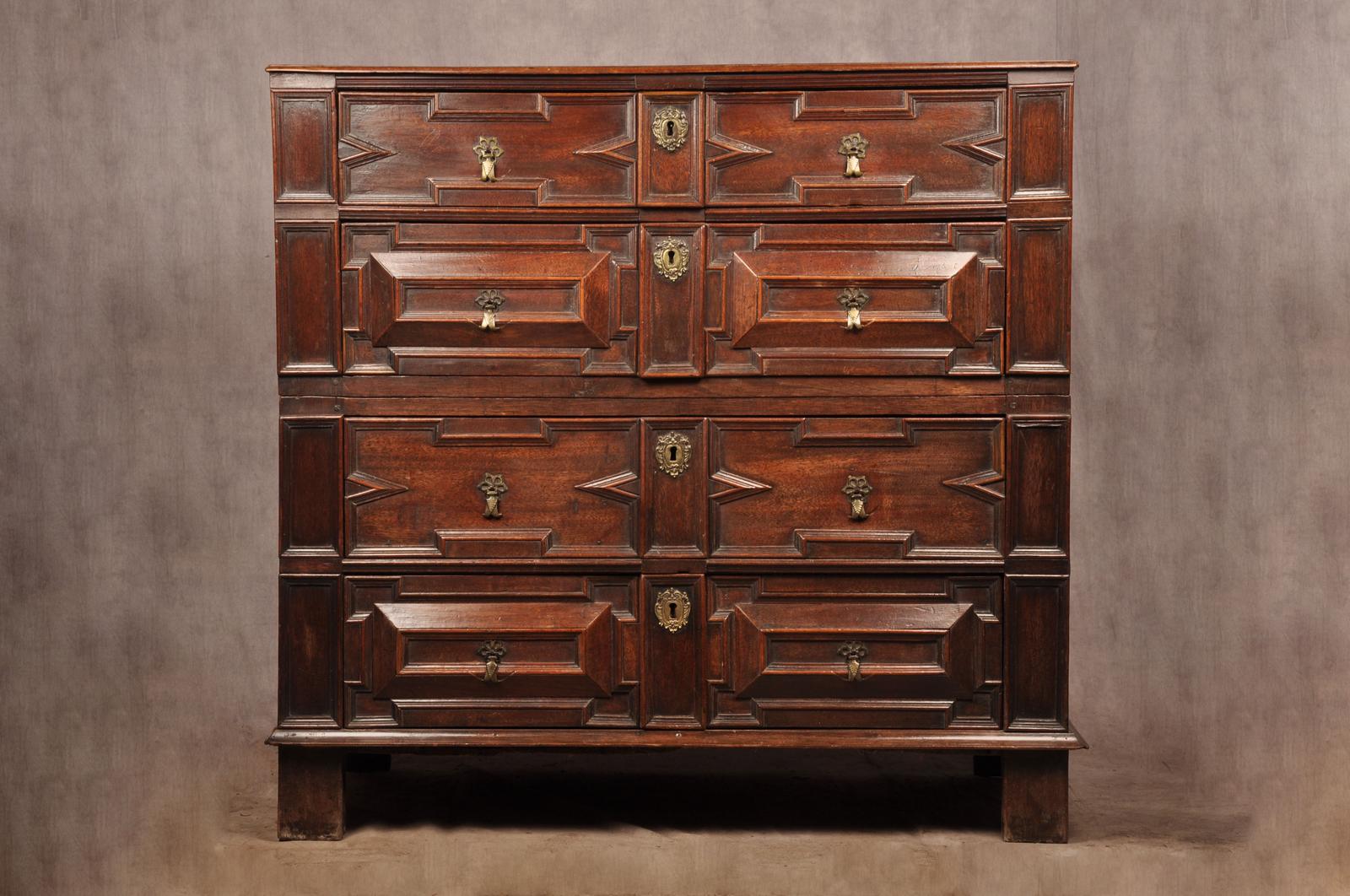 A rare 17th Century antique walnut and fruitwood geometric moulded chest of drawers in outstanding condition retaining the wonderful original brass drop handles and escutcheons, standing tall on all original feet. Having applied sections of Walnut and fruitwood to the front. The chest has a very good untouched colour and surface throughout. Made originally in two parts with loose drop in mortise and tenon joints that still work perfectly.