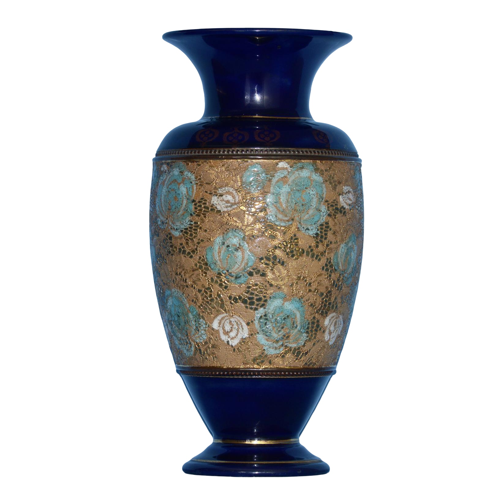 For offer is a rare Antique Doulton Slaters Vase in dark blue and gilt with pale blue stylised roses on a gilt and brown banding, dating from around 1905.