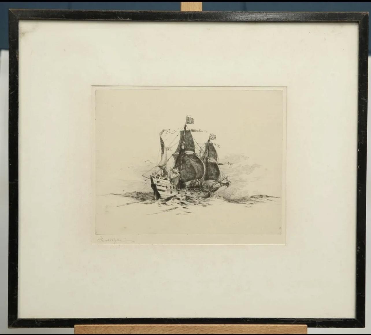 Rare Early 20th Century Signed Etching by Harold Wyllie (1880-1973 ) Gunship