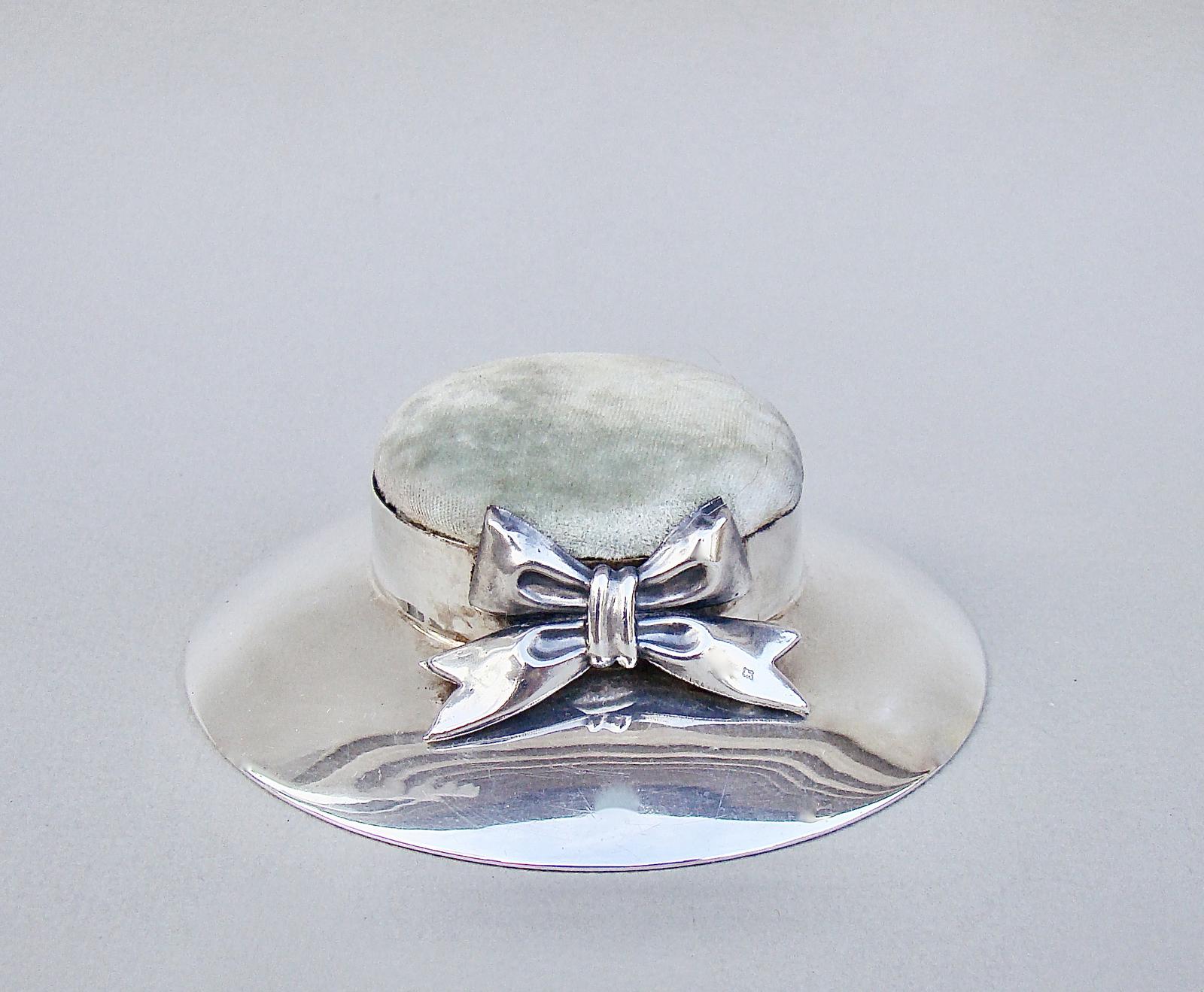 Rare Edwardian silver pin cushion in the form of a lady's hat by Blanckensee & Son Ltd, Chester 1908