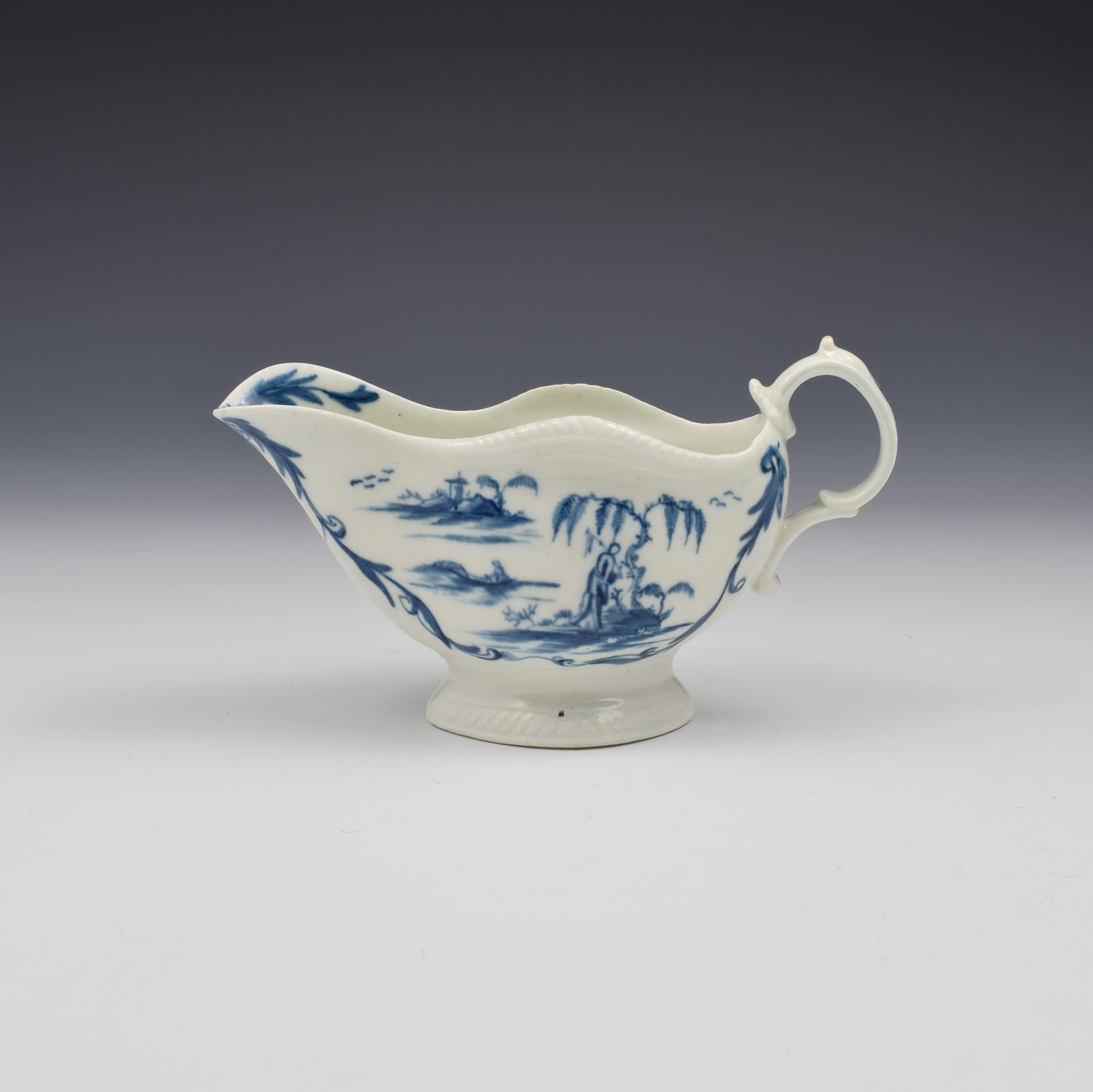 Rare First Period Worcester Porcelain One Porter Landscape Pattern Sauce Boat c.1765