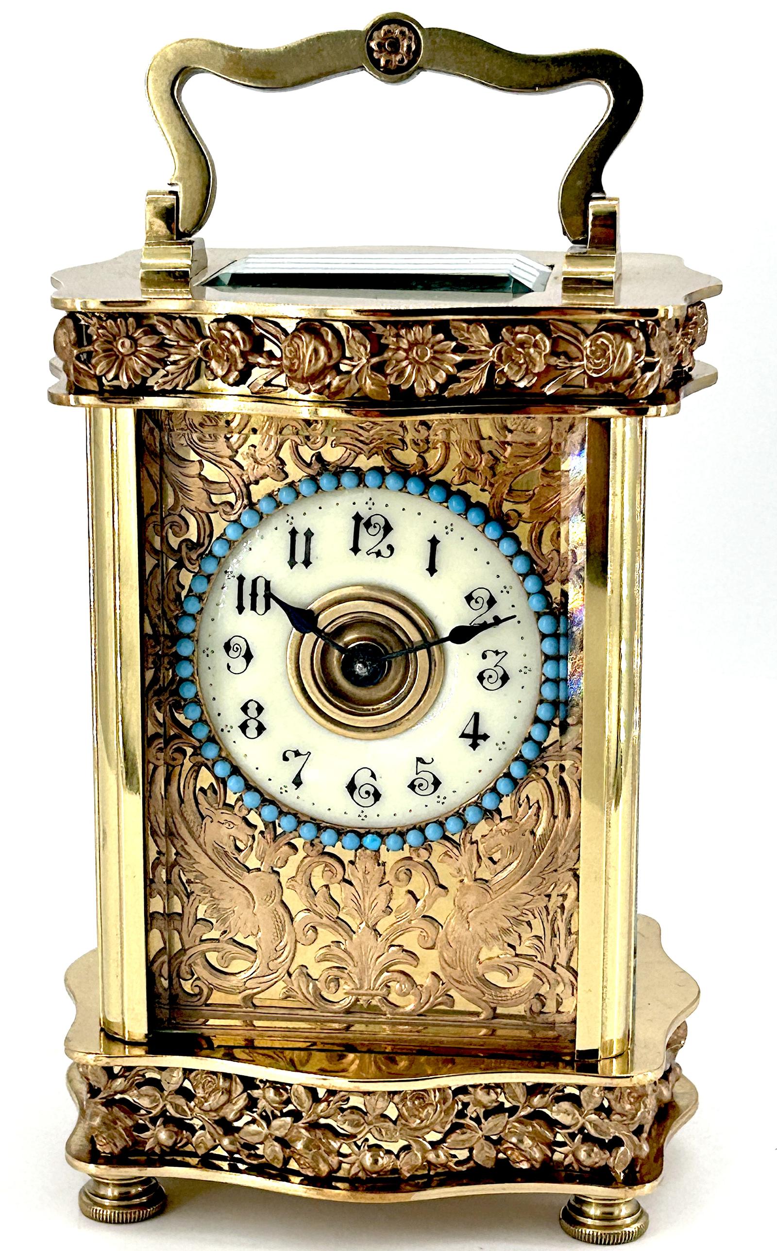 Rare Foliate Antique French 8-day Carriage Clock c.1900 – With Enamel Bead Rim Dial