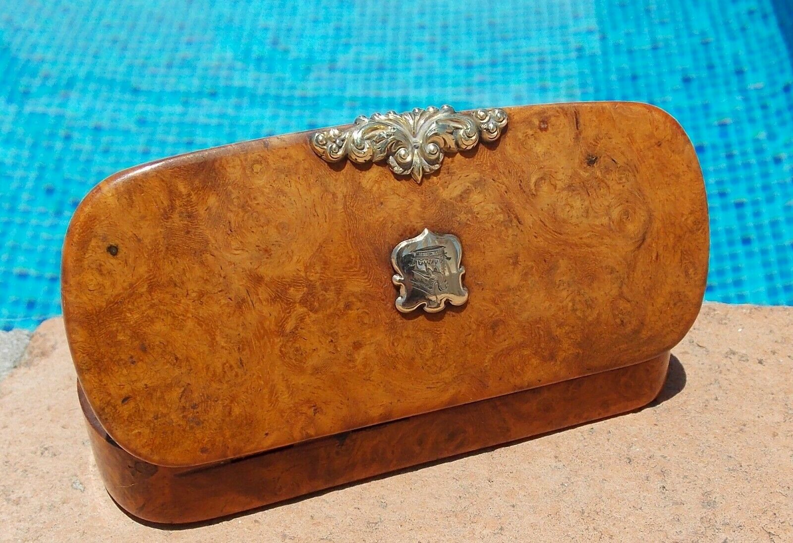 Rare French Georgian 9ct Gold Shield Crown Crest Burr Wood Rectangle Snuff Box c.1800