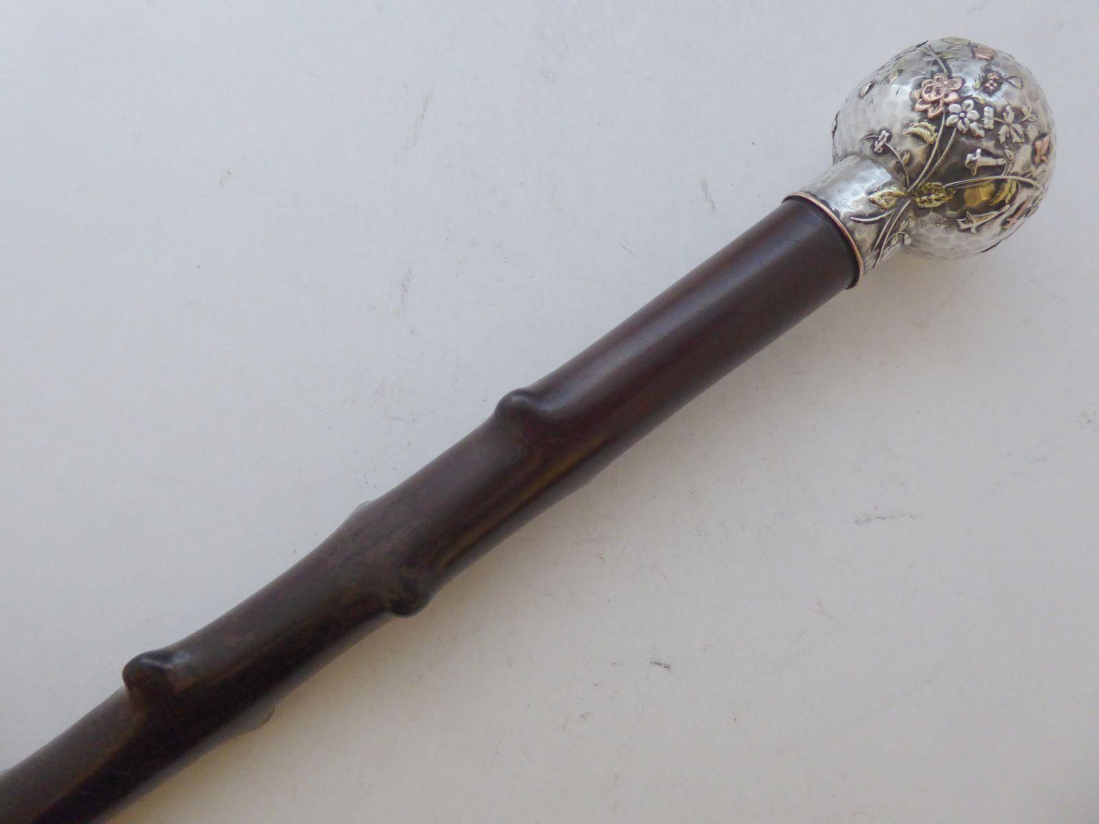 Rare French Walking Stick Cane Silver Gold Copper Pommel Mahogany Shaft c.1880
