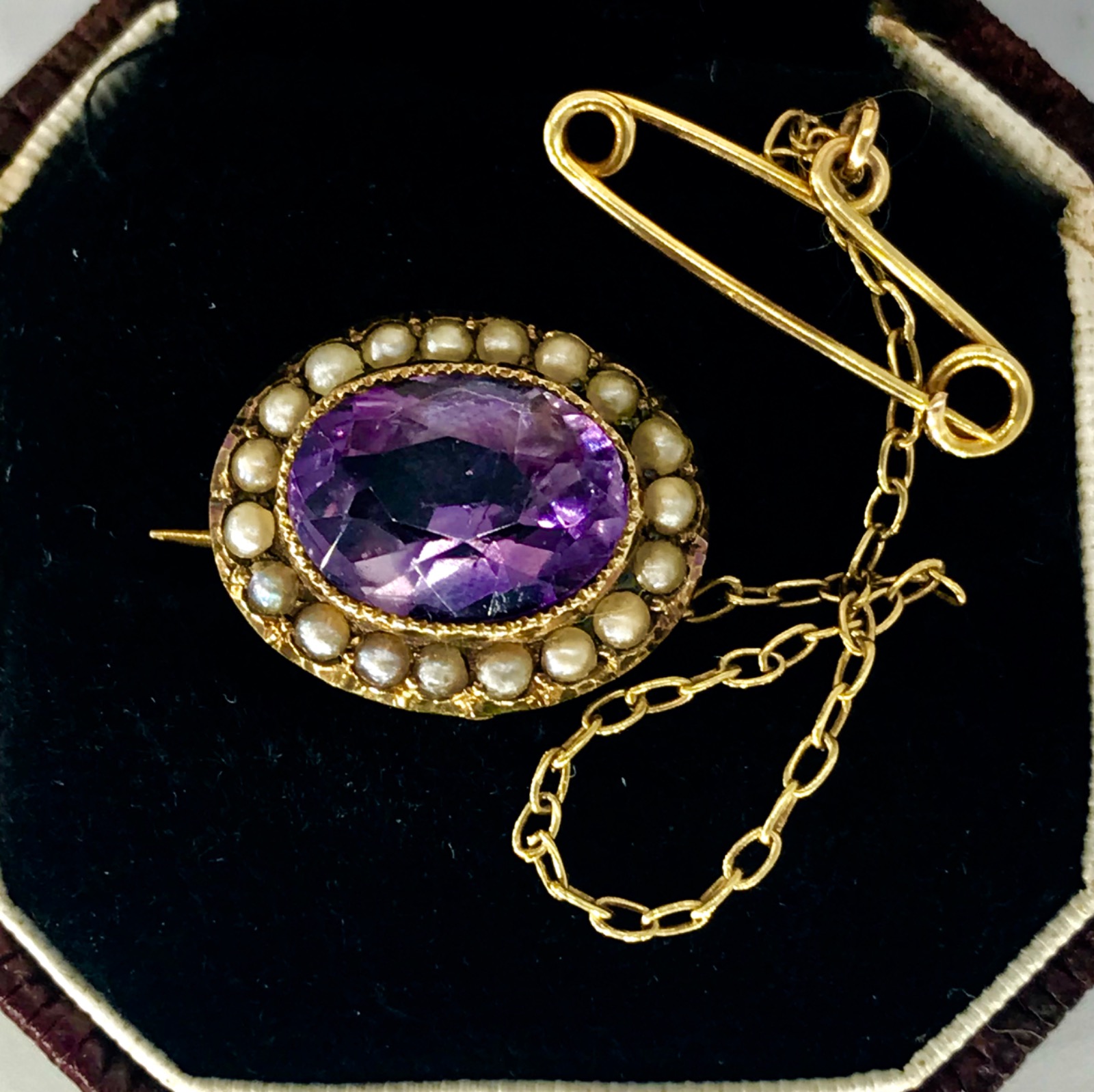 Rare Georgian 15ct Gold Mounted Amethyst & Pearl Brooch c.1820