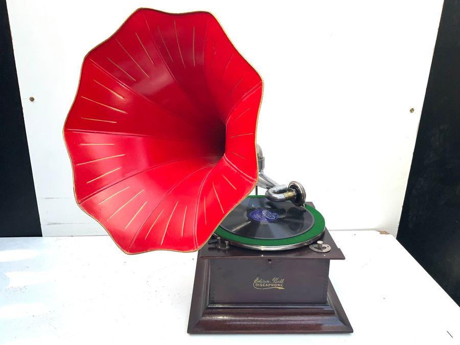 Edison Bell Discaphone Superb mahogany cased gramophone with tin horn that’s been repainted, having a superior twin spring motor by Garrard that’s in superb condition, and fully working, this is quite rare and will make a great decorative and investment.