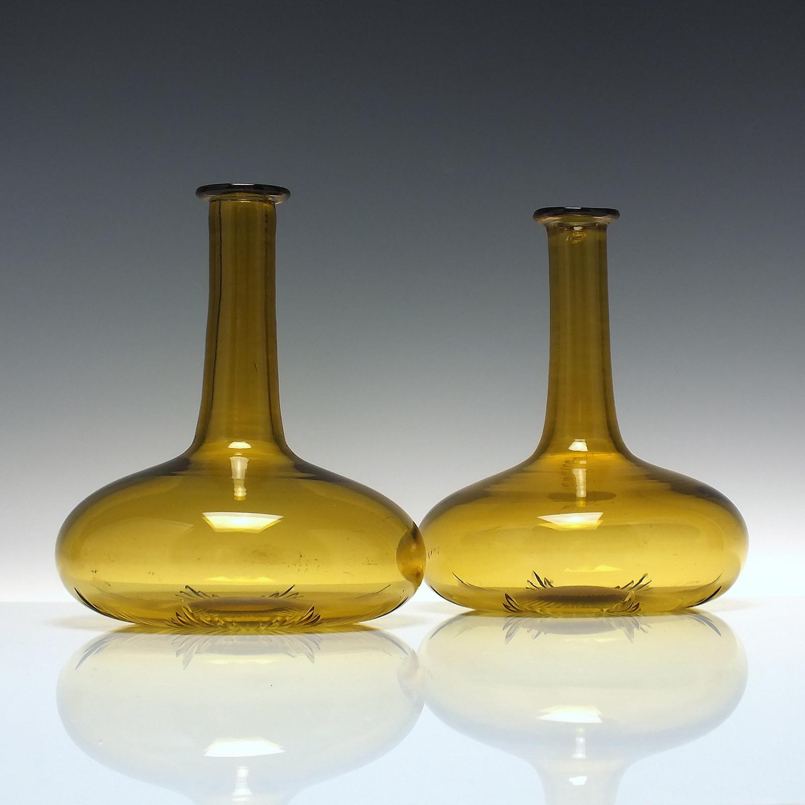 Rare Matching Pair of Antique Georgian Amber Glass Mell Decanters / Carafes c.1830